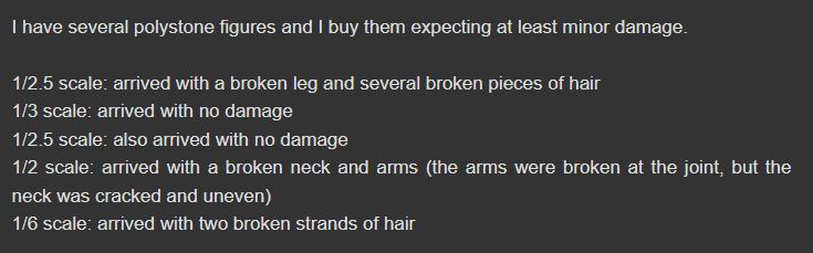 >>52993 >украшение на голове Производитель обещал в релизной версии сделать украшения из серебра. Мб более сложные серебряные украшения выходят слишком дорого. >выпавшие пряди волос, которые в таком масштабе и бюджете можно было сделать Статуи делают из полистоуна. Это такой хрупкий материал, что мелкие пряди будут ломаться от севшей на них мухи и тем более они не переживут транспортировку почтой, поэтому в статуях такого не делают. У многих сомнения что текущая версия будет приезжать целой, а ты еще больше прядей хочешь. Ее предзаказы один фиг за два дня раскупили, а цена на вторичке уже 10000+ юаней (110к+ рублей).