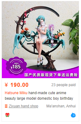 >>52819 Нет, официальный магазин производителя в Китае. Вообще палю фишку - у китайцев есть крупные аниме магазины (например HPOI) продающие только лицензию и часто спрос в японии и китае разный. Поэтому там некоторые фигурки иногда в разы дешевле на вторичке. самый лол что у того же hpoi есть лакибокс с фигурками и они туда весной всем подряд пихали фигурки по фейту, которые в японии стоят дофига