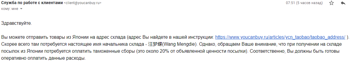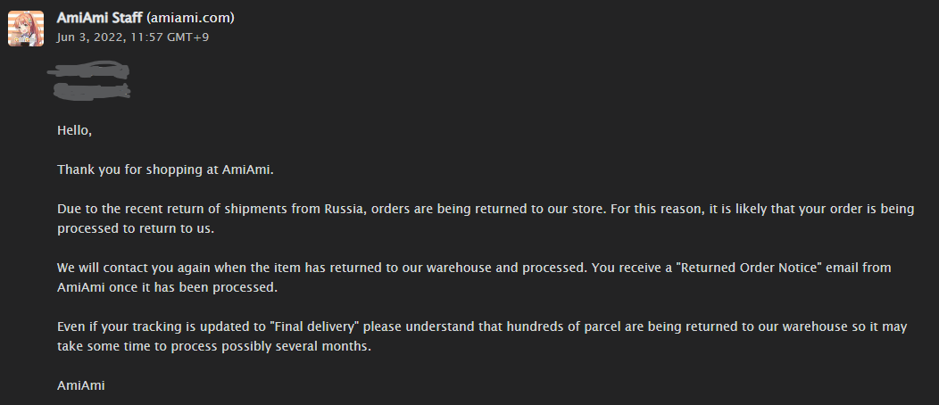 >>54818 Моя посылка за начало декабря была отправлена взад в Японию, получили ее в июне судя по треку. В Саппорт Ами писал в июле, сказали еще не дошли до моей посылки, ожидайте. 27 сентября таки написали о возврате, отправил на склад Боксберри, уже приехала к ним коробка, жду счета на доставку.