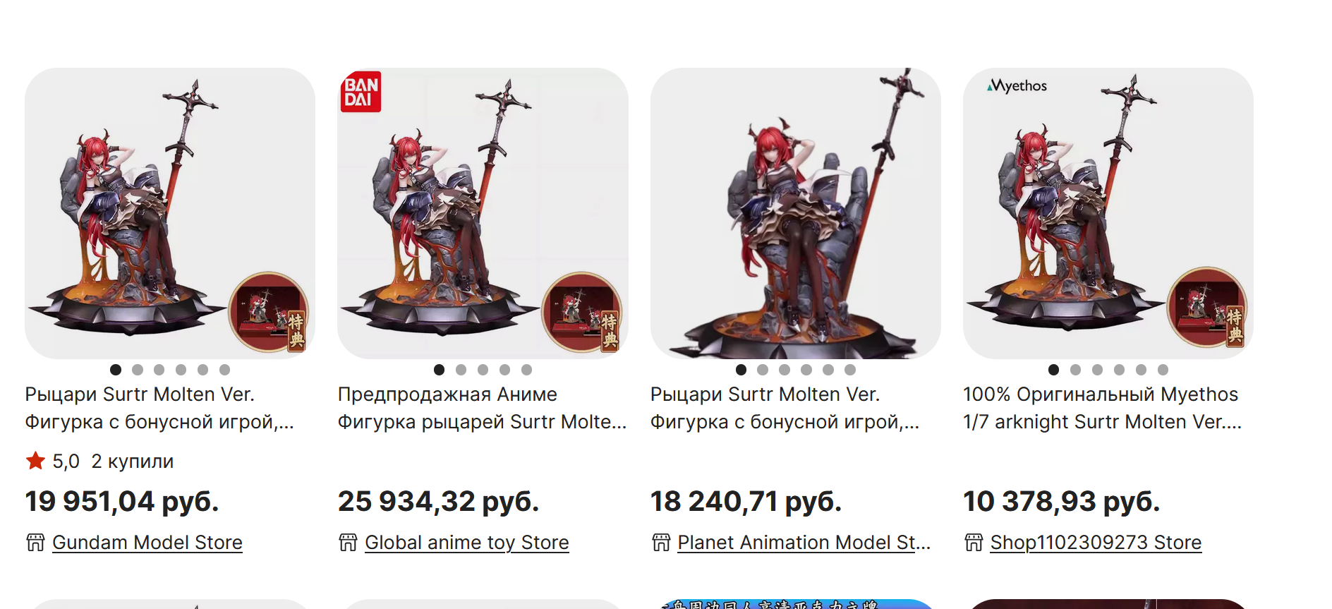 >>55002 Оверпрайс может быть очень легко. И не на пару тыщ, а на 5-10-15 при желании. Все эти магазины на али - сами перекупы. Некоторые не имеют в наличии то, что выставляют на витрину и ищут по своим каналам конкретную фигу под уже сделанный заказ. Обычно именно такие задирают ценник, чтобы точно не оказаться в минусе, если вдруг ляовай у них закажет закажет. Конкретно на Суртр настолько дикого оверпрайса я бы не ждал, всё-таки фигурка по китайскому IP (ушкам), сделанная китайской конторой Миефос на китайских мощностях.