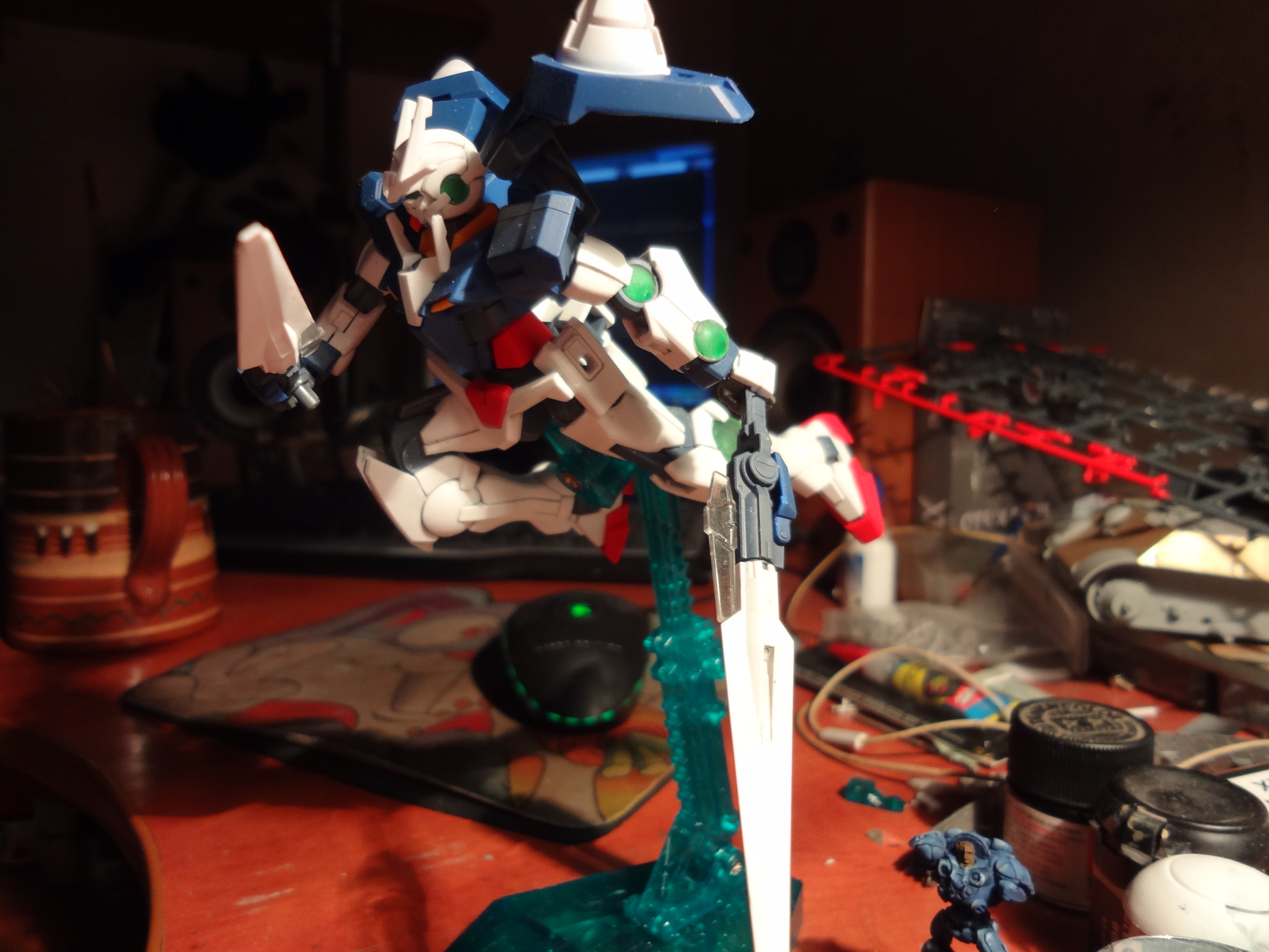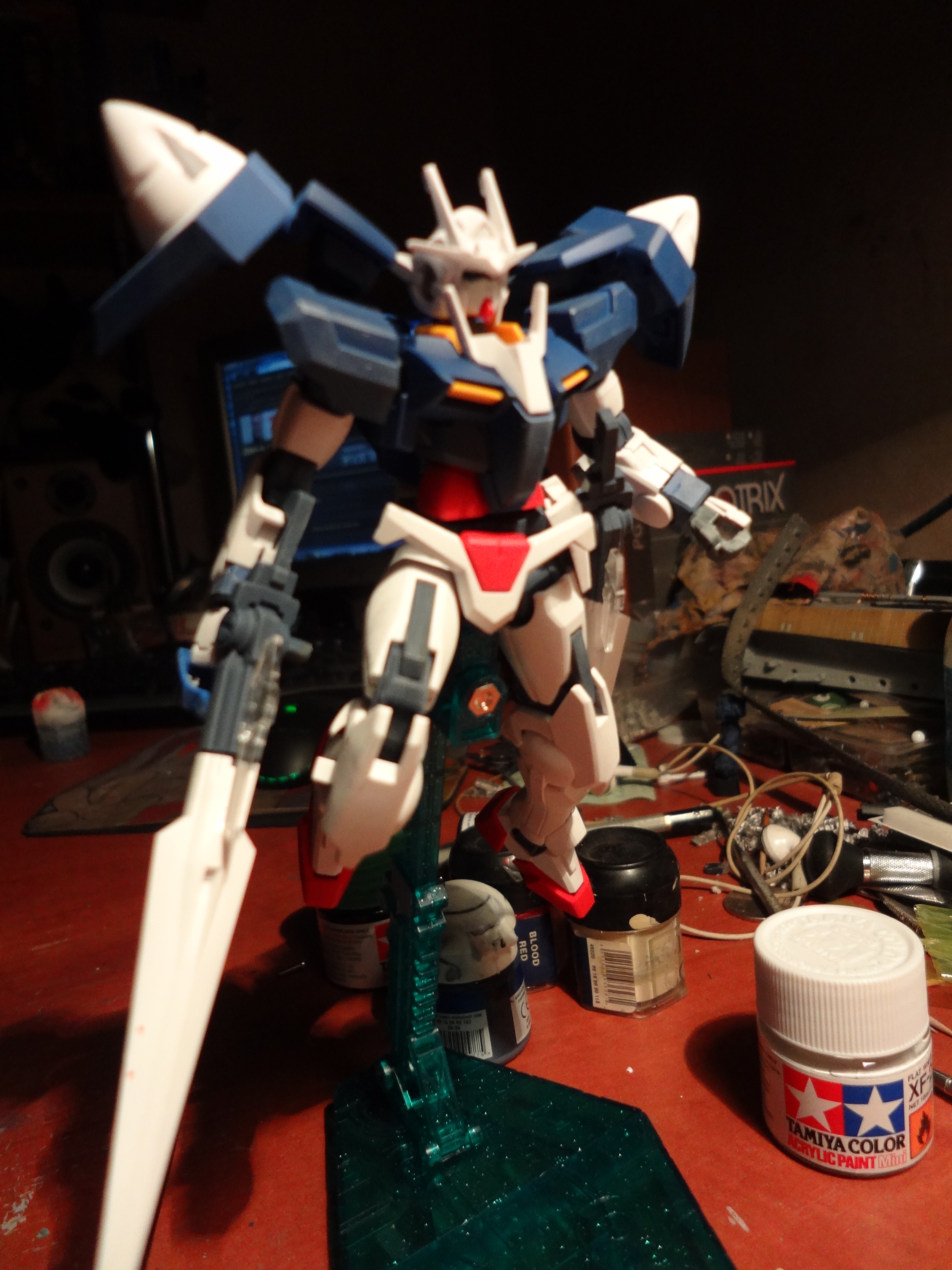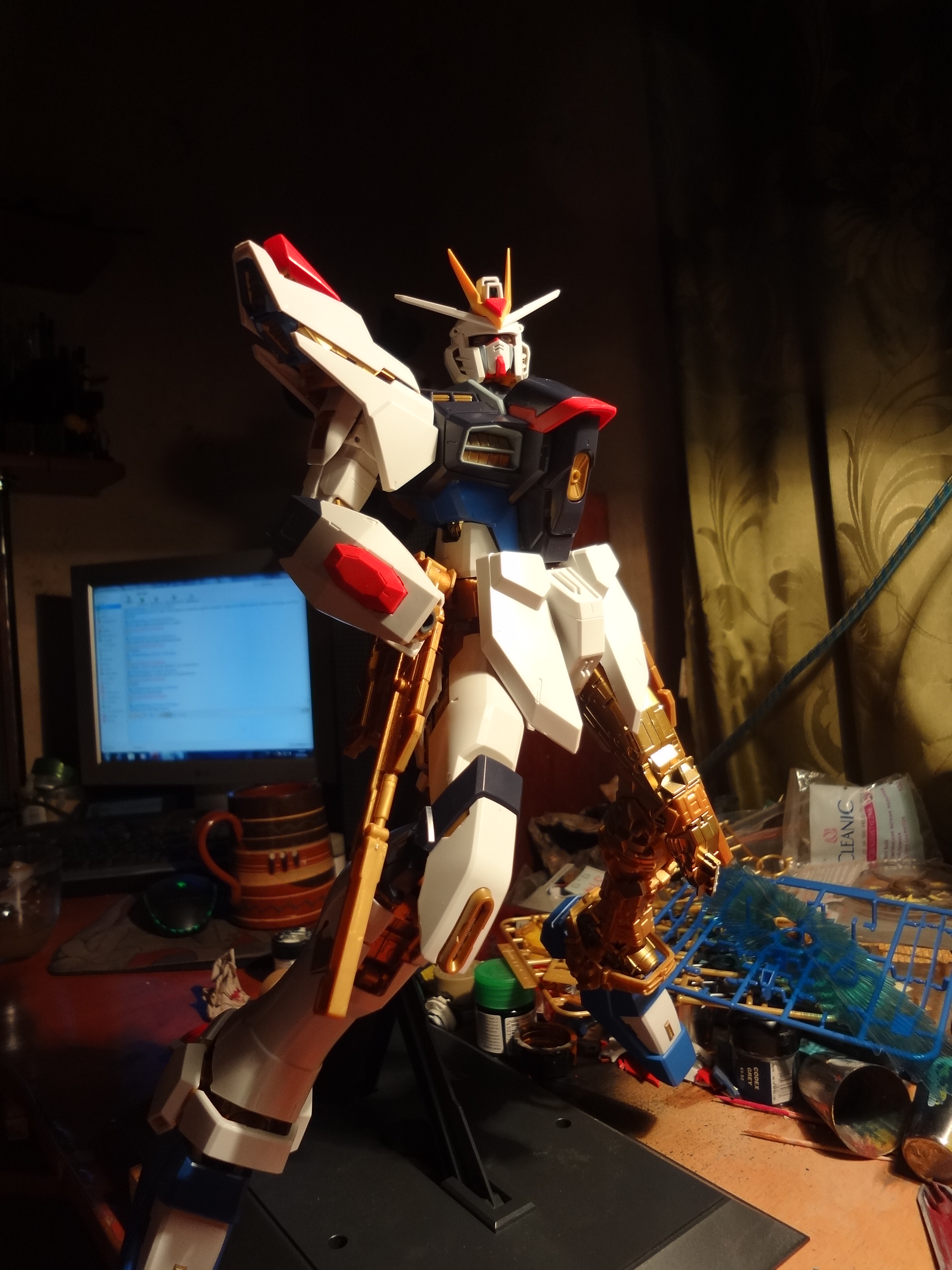 совсем забыл. доделал я гандама. сделал тонировку, наученный опытом многократного перекраса дубль-в (на нем я все время перебарщивал с тонировкой), этого я пролил слабо. огромным допущением было присобачить прозрачные части перед лакировкой. матовый лак убил весь блеск нахрен. рога пока не красил, тк не очень хочется расчехлять аэр ради двух мелких деталей. в общем, такой вот хг. конкретной сборки фоток не будет, тк я мудак, собрал на одном дыхании. увы:3