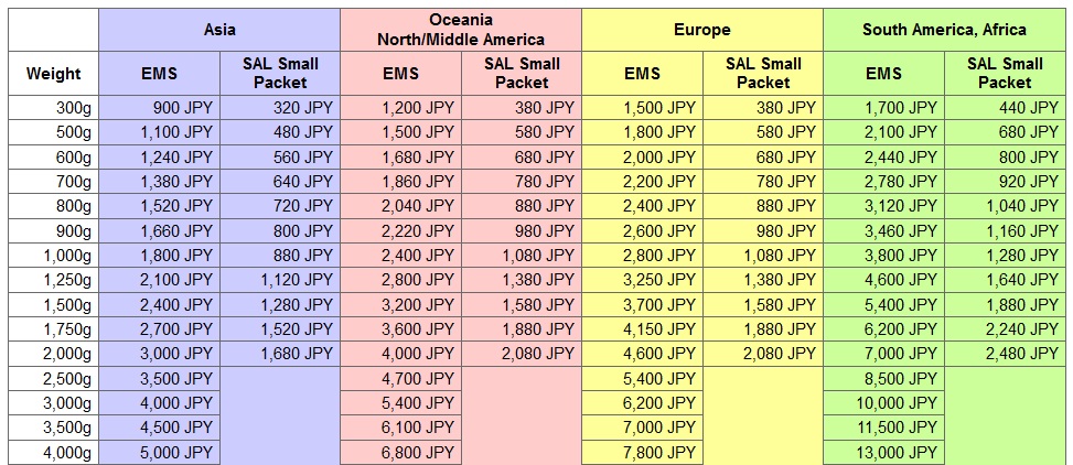 >>4385 >>4385 >сколько в среднем стоит доставка считаем вес покупаемых товаров, добавляем (около до веса в 2кг)500-700г, сверяемся(например пик) с табличкой. Если решишь сэкономить и отправляться салом, то доставка не дороже 2тыс.йен, но нужно уложиться в общий вес не более 2 кг и суммы шир-дл-выс не более 90см с учетом почтовой коробки (некоторые магазины добавляют еще ограничение по цене не более 15тыс), иначе заказ будут пилить на несколько посылок. Для емс такого не нужно.