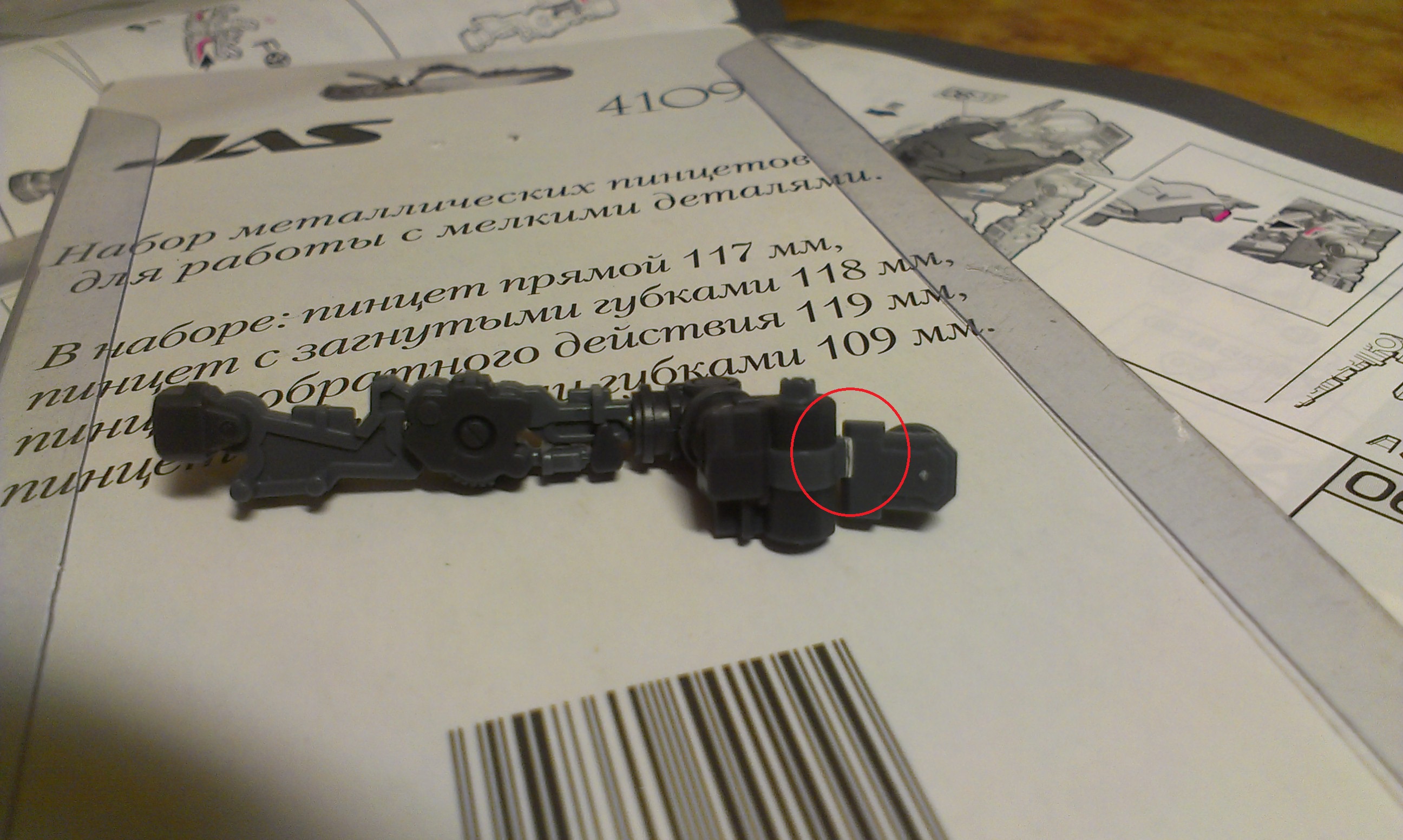 >>13815 1) Ну вот щиток на правую ногу нормально наделся, но на левую не хотел ни в какую. После осмотра оказалось, что ему не давал надеться сликшом глубоко одетый голенный щиток. 2) Так есть одна пластиковая веревочка, но она задействуется при сборке торса. А при сборке талии надо делать почти такую же цепочку, но насаживать уже не на что. Причем, в комплекте есть 4 пружинки, но они туда тоже не подойдут вроде. И вообще нигде не используются. 3) Холодное оружие держится нормально, а вот огнестрельное вываливается из-за веса. 4) Эксклюзивная на АмиАми уже распродана, а вот обычные закажу в следующий раз. Только вот сомневаюсь, выдержит ли пластмассовая подставка вес робота - он весит около 700 грамм.
