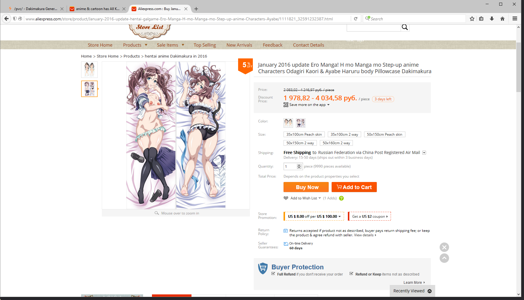 Я заказывал через Mistertao, но там работают редкостные пидорасы, которые при малейших сомнениях заворачивают твой заказ с формулировкой "это оружие". Естественно, дакимакура тоже оказалась оружием, и мне завернули заказ, но через техподдержку смог выпытать, что они подумали, что она может быть подделкой, и мне не понравится ее качество после того, как я ей попользуюсь и постираю несколько раз. Именно так и написали, а мое мнение по этому вопросу не сочли нужным спросить. Пришлось писать отказ от ответственности, что она меня устроит в любом случае.