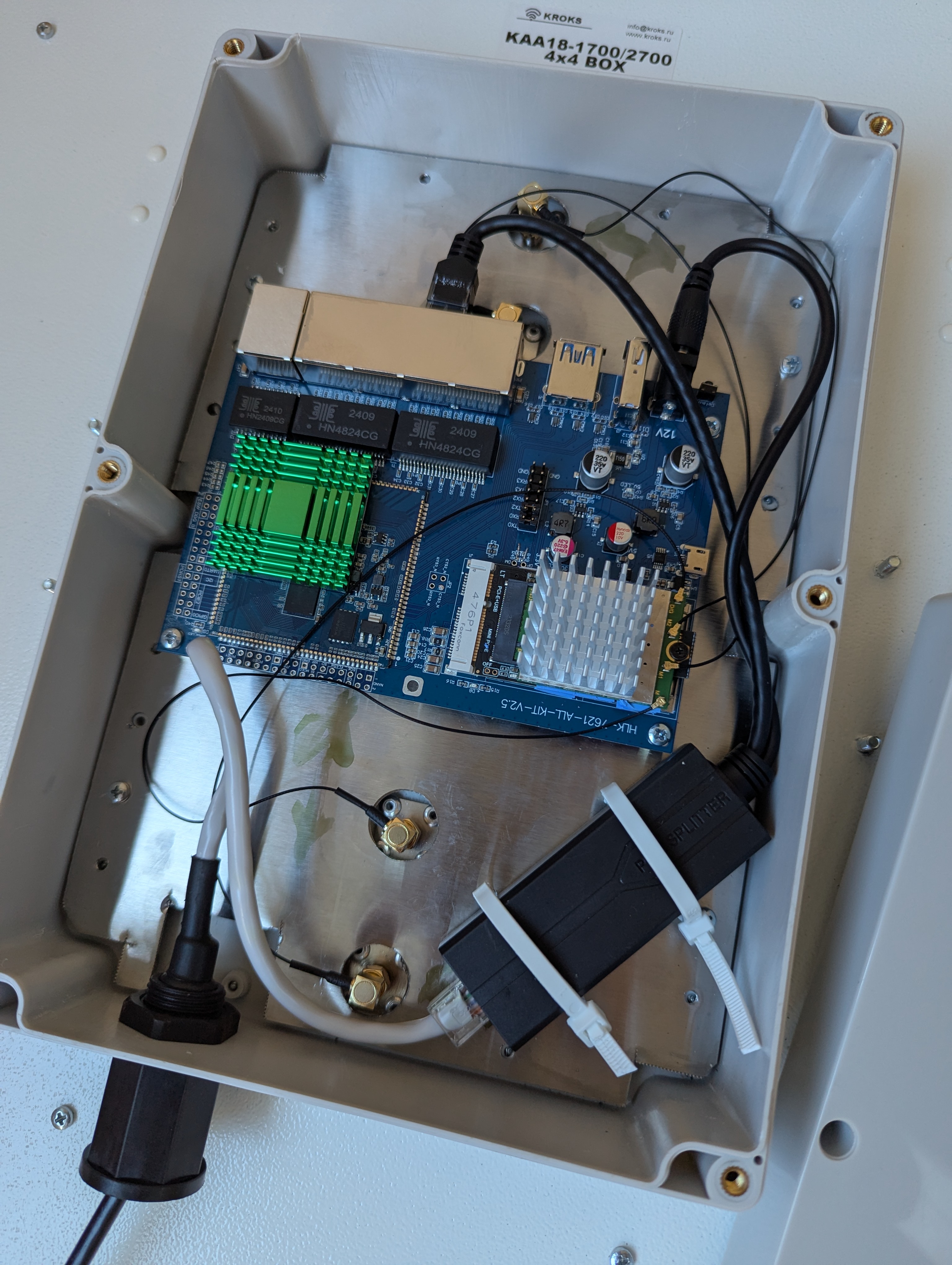Я решил сделать интернет в деревне. Ловило на телефон очень плохо, надо было ходить по участку и искать точку, где хоть как-то появлялся 3g. Я собрал систему на базе Fibocom L860 и отладочной платы с Openwrt, разместил всё в гермобоксе широкодиапазонной панельной антенны на 18 дБи. СВЧ длинным делать некрасиво, поэтому весь аналог короткий, 20 см. В гермобокс входит гигабитный PoE. Результат впечатлил - стабильная скорость загрузки в 70 мбит, в моменты было выше 100.