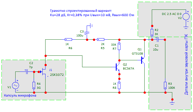 >>578410 Куча лишних деталей. Микрофонный вход звуковой карты имеет вот такие цепи "внутри". Соответственно должен работать вот такой огрызок схемы. мимо