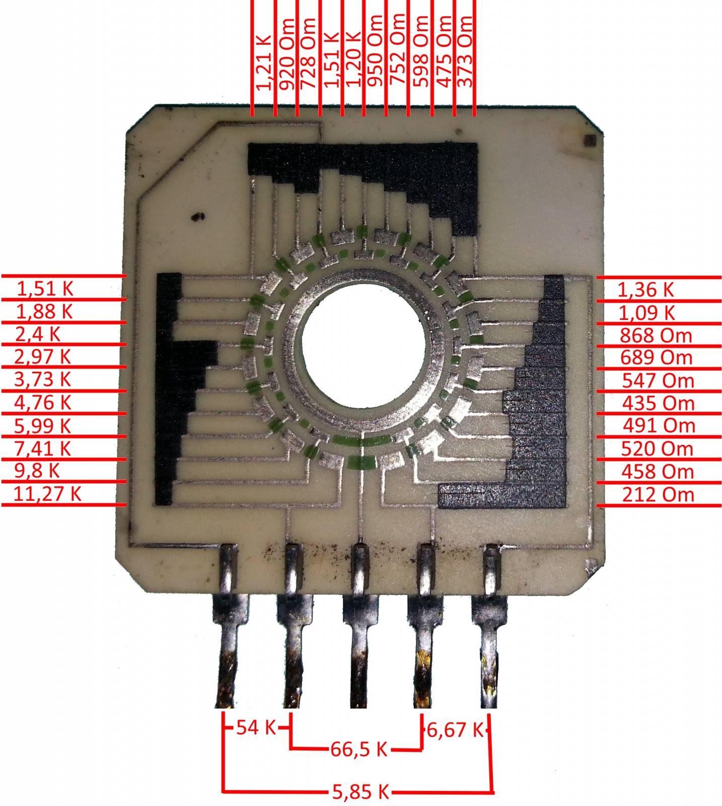 Приобрел усилок кумир у001 (вариант схемы с регулятором РП1-57Е (220 кОм), вместо которого вкорячен обычный переменник). Хочу восстановить работоспособность усилка как задумывалось. Имеется возможность изготовить регулятор на дискретных элементах, а для этого нужно знать значения сопротивлений каждого отдельного резистора (пример на пичке для 68 кОм регулятора). Может у кого есть возможность провести измерения или имеется готовая картинка/табличка?