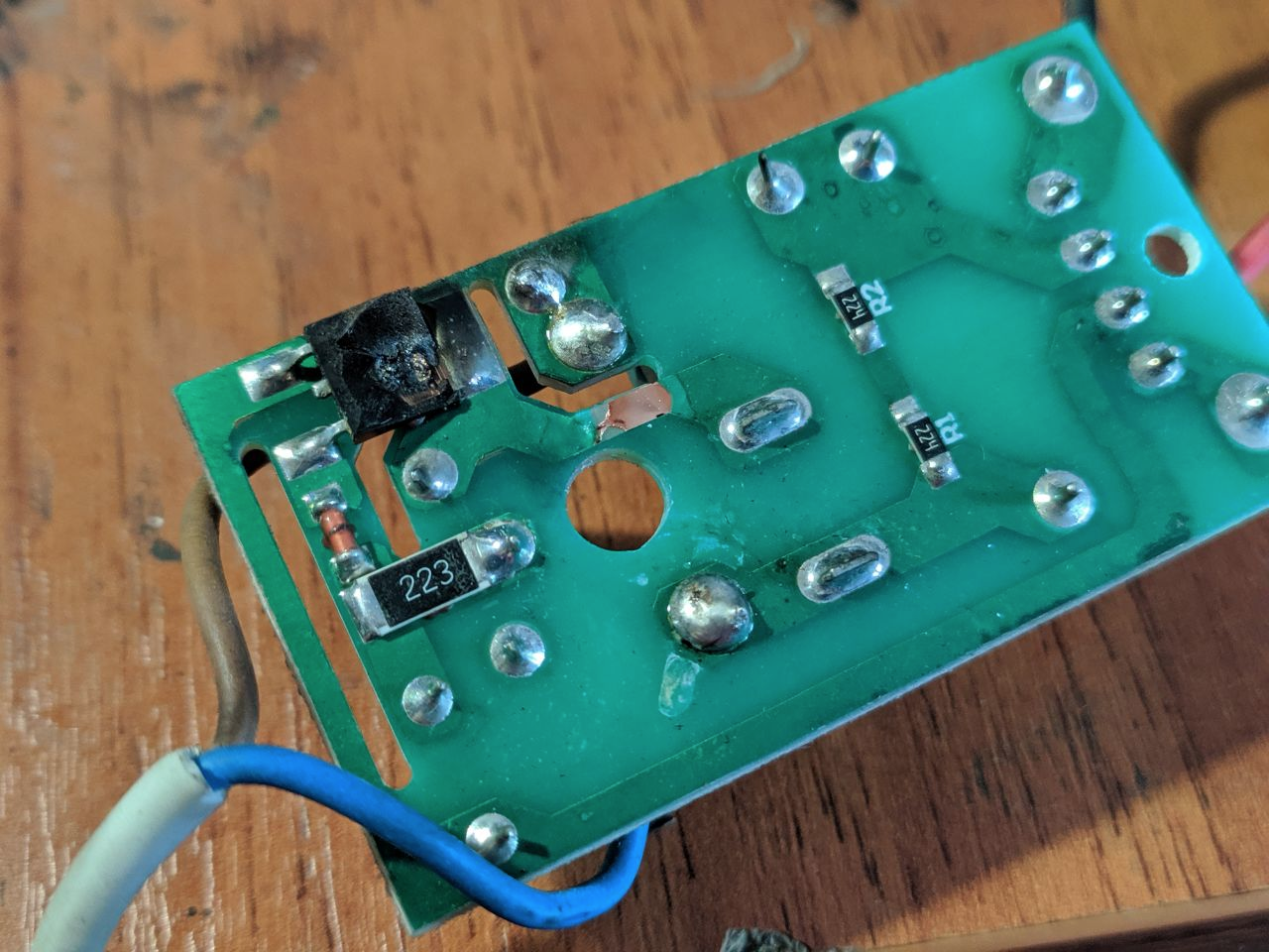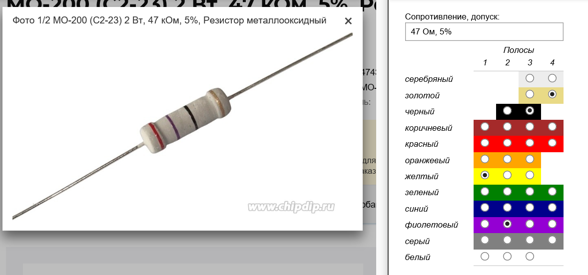 В зарядке бахнул резистор со странной маркировкой в 5-ть колец: жёлтый, фиолетовый, золотой, золотой, чёрный. На плате подписано, что это должен быть резистор номиналом 2,2 Ом 1 Вт, но по известным мне калькуляторам это нифига не бьётся...