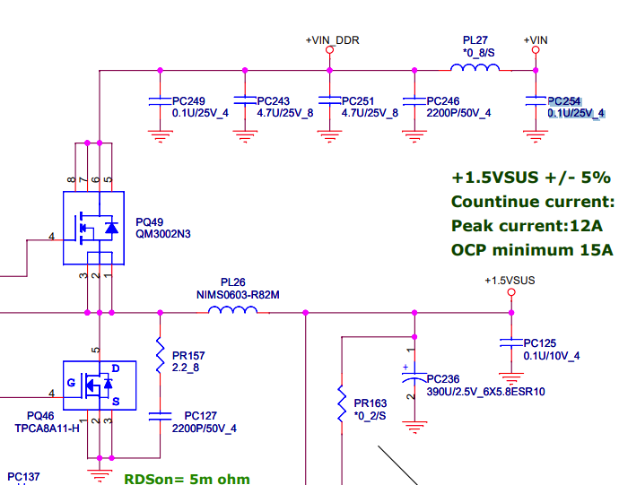 >>308945 Проверь, куда идут дорожки от толстых переходных отверстий. Если одна на землю, вторая на одно из питаний - там два полевика в составе силовой части синхронного step-down. По маркировке не подскажу, не пробилась.
