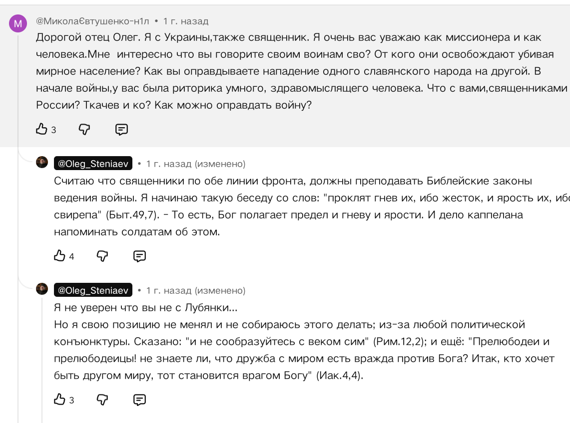 >>1163840 >То что церковь поддерживает спецоперацию это правильно или нет? Да это правильно так как если этого не делать то нас уничтожат. Мы рабы божьи, а они хотят погрузить мир в хаос. Почему они не подчинились? Следовательно они не христиане либо Бог для них не первичен. Следовательно СВО это благо. Они могли просто подчиниться и всего этого не было бы. Зачем они сопротивляются?