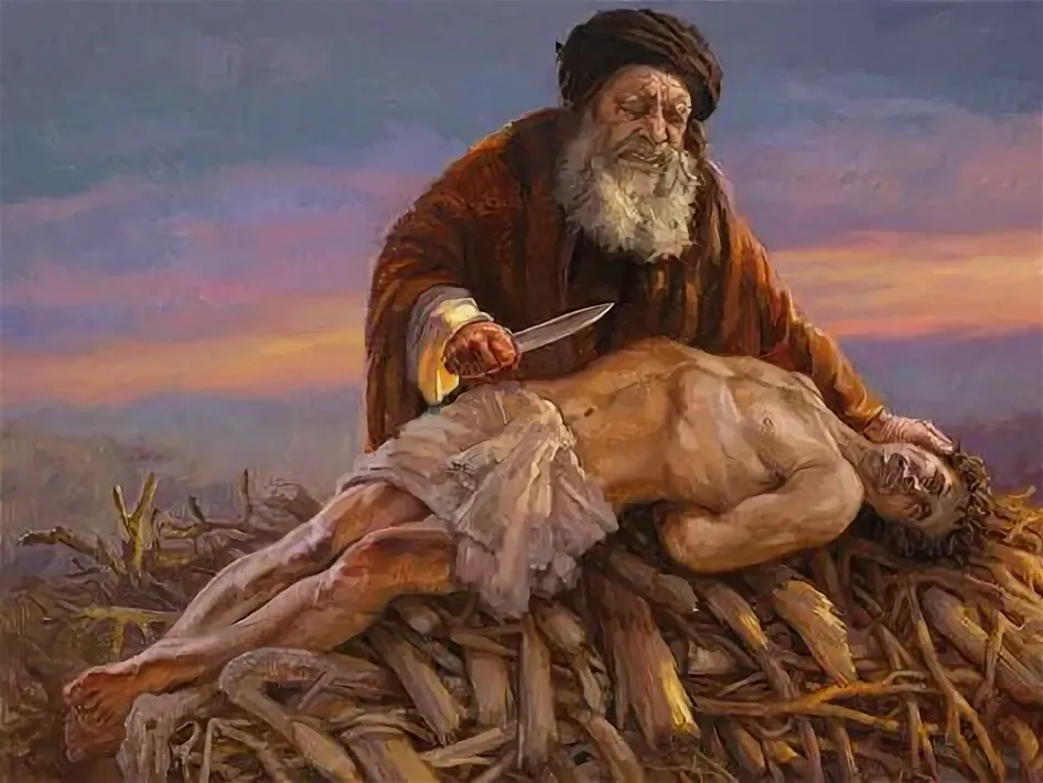 >Бог сказал: возьми сына твоего, единственного твоего, которого ты любишь, Исаака; и пойди в землю Мориа и там принеси его во всесожжение >И пришли на место, о котором сказал ему Бог; и устроил там Авраам жертвенник, разложил дрова и, связав сына своего Исаака, положил его на жертвенник поверх дров. >И простер Авраам руку свою и взял нож, чтобы заколоть сына своего. >Но Ангел Господень воззвал к нему с неба и сказал: Авраам! Авраам! Он сказал: вот я. >Ангел сказал: не поднимай руки твоей на отрока и не делай над ним ничего, ибо теперь Я знаю, что боишься ты Бога и не пожалел сына твоего, единственного твоего, для Меня.