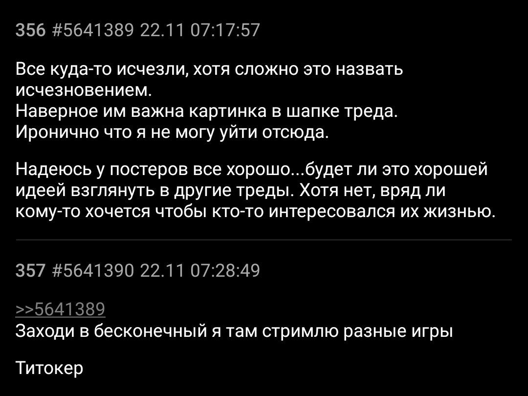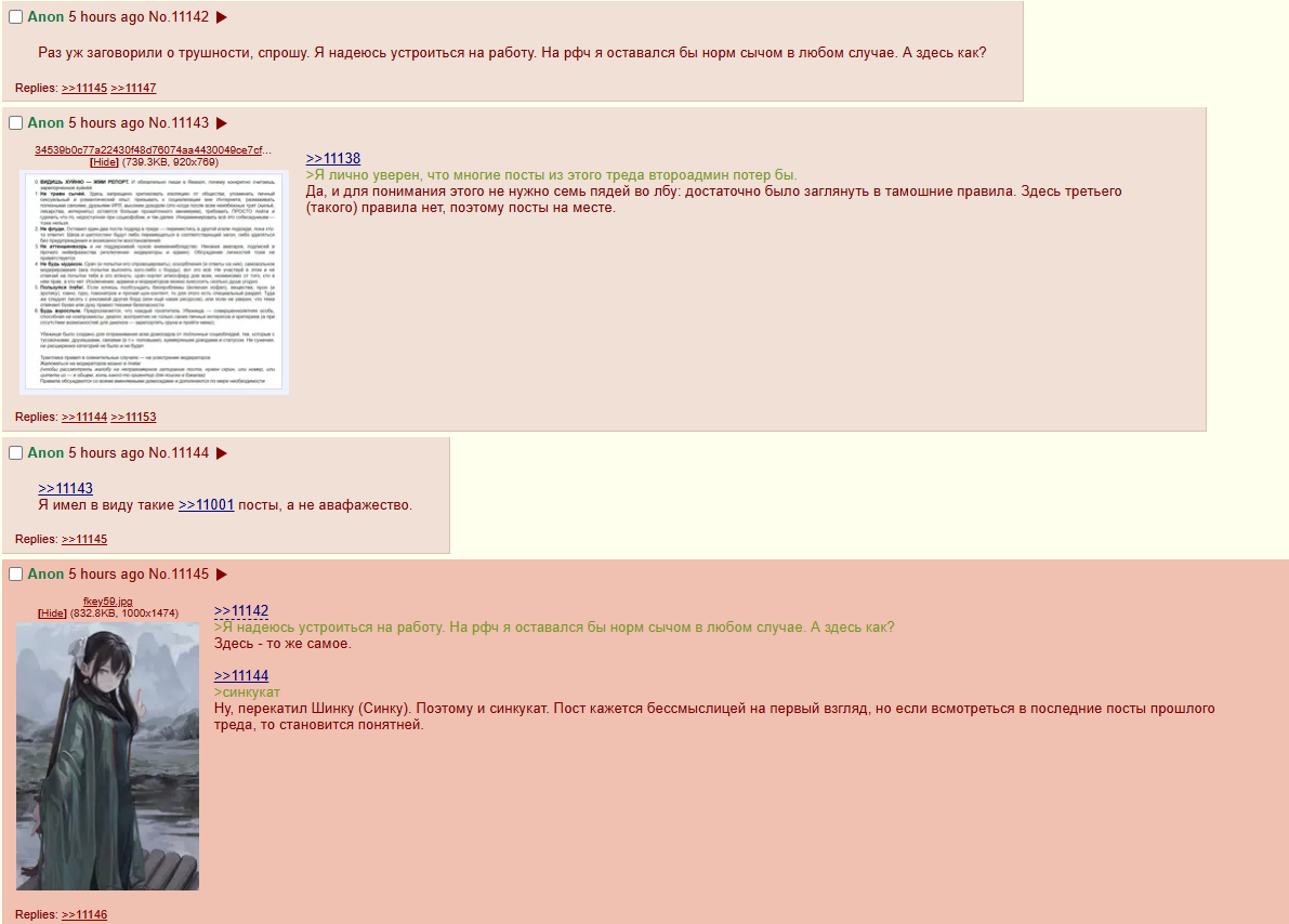 >>5643658 Я не знаю, я видел в дискорде он в последний раз там отписывался вроде по поводу бана этого существа. >>5643662 >почему ему тогда бан не выдали, а разрешали постить про работы? Я понятия не имею. Его постоянно банили вместе с его паскодами, но он постоянно шел плакаться в дискорд и его разбанивали. >>5643676 В бесконечный вернись, тебе вообще никто никогда писать не будет. И именно поэтому ты этого не сделаешь. >>5643693 >Тут даж не бревно в глазу, а Да я эту банальность в его адрес даже писать не стал. Это и не про него собственно на самом деле, поскольку он как раз все свои бревна прекрасно осознает, он просто психопат.