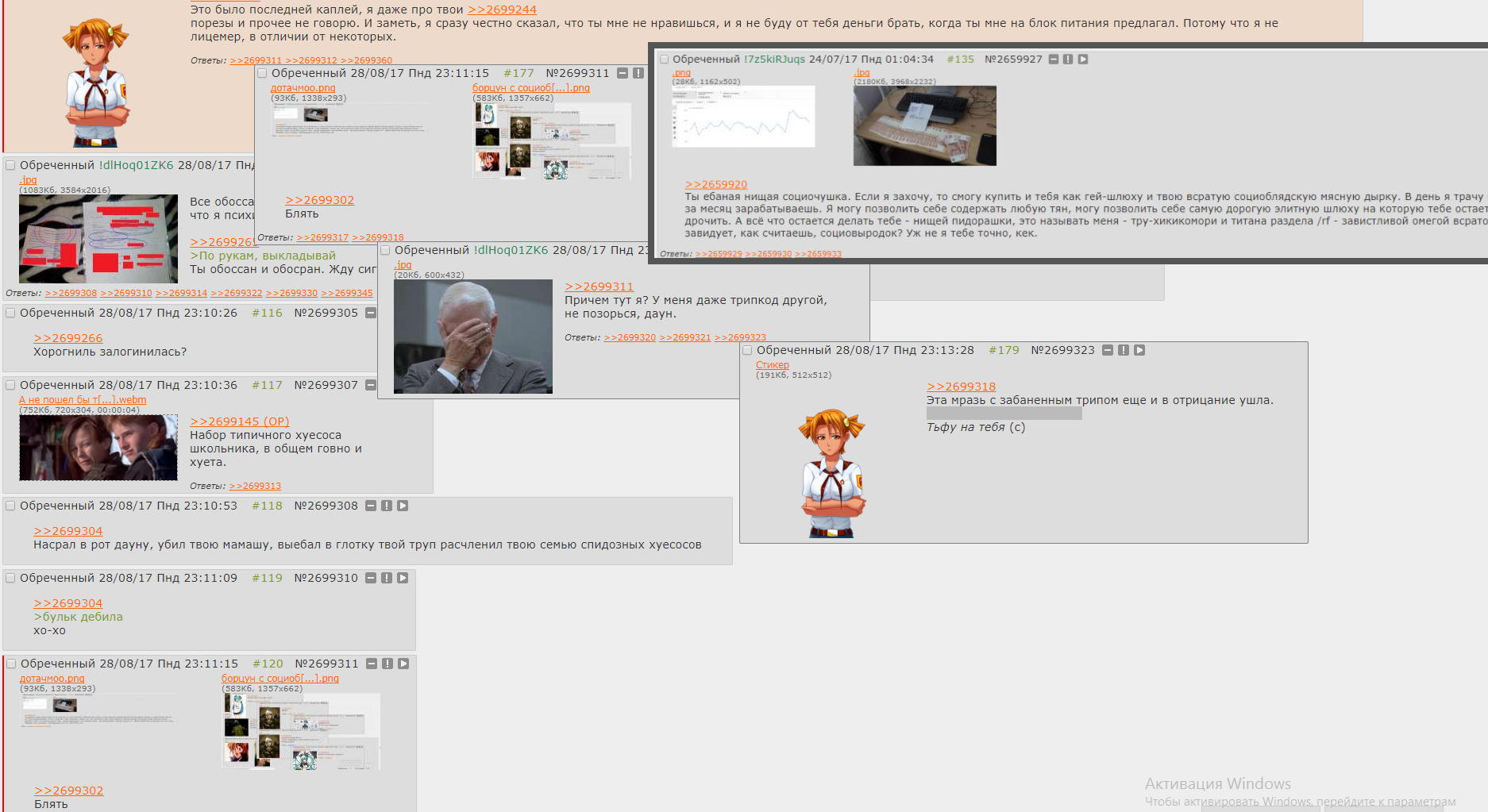 >>5664679 В каком месте, я же выше уже написал. Когда башню сносит ты мечтаешь человека убить голыми руками - у меня так. И пускаешь в ход все инструменты, пытаясь нащупать болевую точку врага, это же стандартная тактика всех срачей, тем более на дваче. И я всегда так делал, а потом какая-нибудь Алиса это скринит и бегает кричит "он травит нищих". Ну нельзя вырывать же так из контекста. Не одобрял я ни какую травлю, меня самого всю жизнь травят, ау, меня в школе жестко травили и из-за этого у меня как минимум одна психологическая травма. Я всегда был против травли и даже тут в /rf в бесконечном еще до разделения писал, что травля никак не может быть оправдана и даже всяких дилдоков нужно не травить, а бойкотировать.