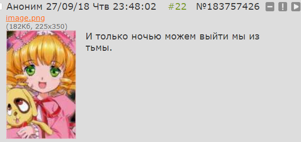 >>132234 Хорошо, ты меня утешил. А на что вы здесь собственно рассчитываете, чего хотите от треда и этой доски? >>132235 Немного другое имел в виду, но не важно уже. >>132236 >У вас тут приятно О, спасибо. Да по сравнению с бэ здесь довольно лампово, но ещё раз хочу напомнить насчет скорости доски. По 10 перекатов в день здесь точно не будет и ответить на пост могут через несколько дней. Зато можно более вдумчивые, более серьёзные посты писать и не торопиться, и отвечать более детально и хорошо подумав соответственно. В этом есть некое преимущество для общения даже. И ещё хочу порекомендовать более детально ознакомиться с аниме и мангой, пересмотреть, перечитать, чтоб не выглядеть слоупоком или двоечником, не выучившим уроки при внезапном обсуждении RM. Как ни крути, а ведь это тематическая доска, хотя этот тред и предназначен для разговоров не только куклах.