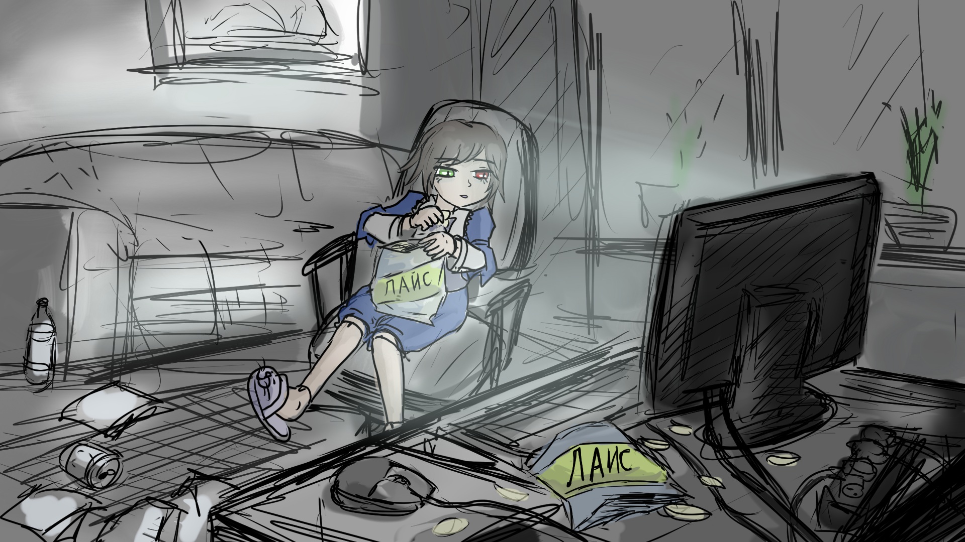 >>132526 Ну не знаю, не знаю.. Диван продавлен с одного краю, кресло слегка скособочено, монитор маленький, а значит старый, везде срач и серые тусклые тона. Есть в этом что-то запущенное и безысходное, как и должно быть у нормального хикки. Но блин это даже не набросок, а обычный мэдскилз, нарисованный за пять минут и называть это красотой у меня лично язык не повернётся.
