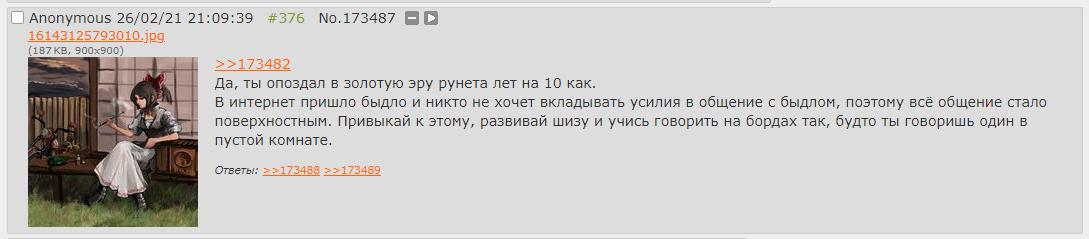 Суть в том что за десять лет концепция самого интернета изменилась, сейчас никто ничего не создает, контента существует громадное количество, по этому обывателю нет никакого смысла делать что-то самому, а ведь борды держались именно на этом. По этому сейчас тут, да и на других бордах так тухло, последние "эпичные" треды из местного /b/ - муссирование темы куколдинга, смешно.