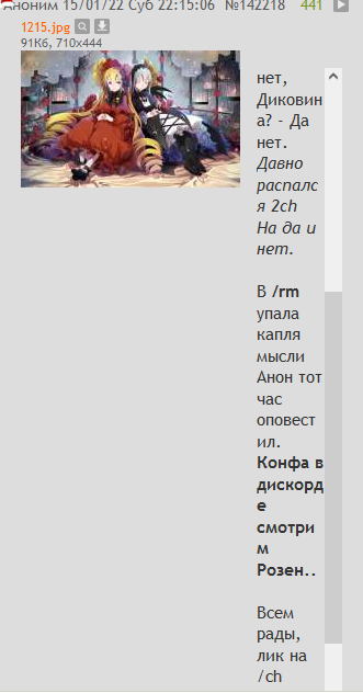 >>142073 Какой бы эта мысль ни казалась прикольной, но я ничего не задумывал. На тот момент Улиточку перестали постить - я подобрал упавшее знамя. Пофиг, кто этим занимается. Это прикольный уже обычай, вот я и решил его поддержать. А Сусеку я прикреплял только как усиление фразы "Щито поделать десу", очень уж она меня прикалывает. Ну и RM тоже мне чрезвычайно понравилось, это да. Я вообще до этого из аниме только работы Миядзаки по ОРТ смотрел и Initial D, кстати. Ну а розенфаги на это случайно наткнулись, слово за слово, вот и получалось в общей сложности примерно неделю постоянно с ними встречаться. Ладно, анончики, пойду спать. Завтра на работу, и так не высыпаюсь. Спокойной ночи!