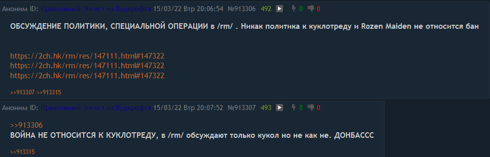 Включая /б, в основном перепалки с молчаливыми, но чуть реже, чем здесь, куклами, краткие обсуждения цикад и ещё каких-либо произведений, генерация лулзов и боевых пикчей не со стороны кукол.
