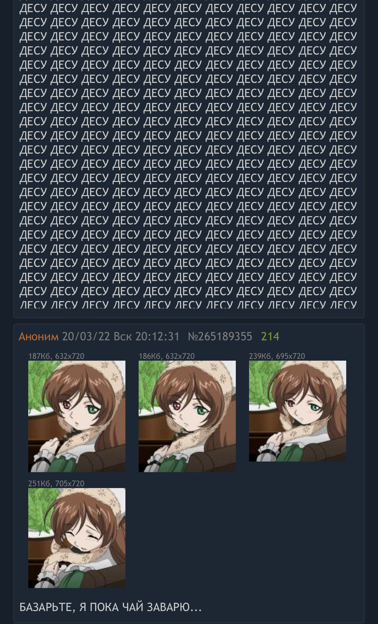 >>147906 Кто-то сюда, а кто-то просто пару пикчей там вбросит и... Ну, и всё. Изредка что-то обсуждается и "воюется". ` Куклам же особо и нечего обсуждать. Это видно и по тому, как здесь зачастую стабильная тишина стоит. А если что и начинается, так это стандарт чаепитий, пара слов — и вот ты уже дошёл до дна чашки. Повторяй, либо в чемодан.