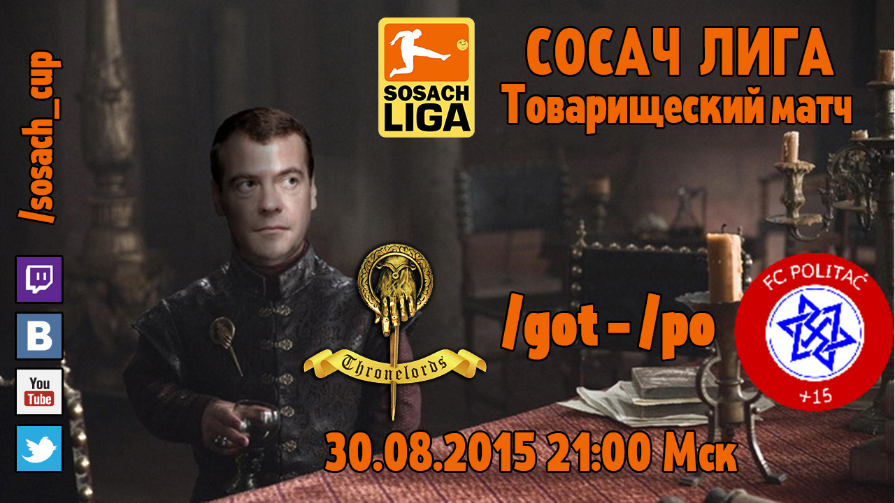 Сегодня будет товарищеский матч между новой командой от доски /got (игра престолов тип) и Политачом. Матч пройдет в 21:00 по ДС на нашем канале http://www.twitch.tv/sosach_cup И помните: зима близко футбол для быдла, смотрите Сосач Лигу!