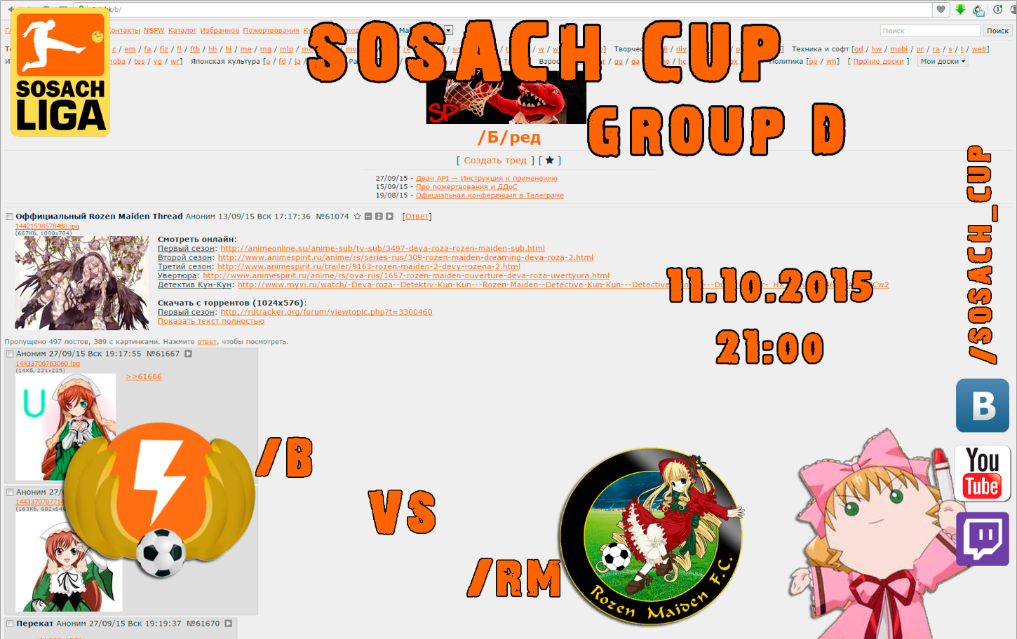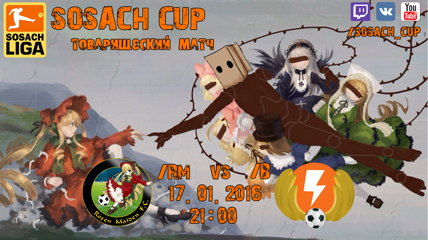 #ТРЕДЖИВИ ну пожалуйста Я тут матч нам выбил на завтра, против /b/ играться будем. Матч товарищеский, на положение в группе влиять никак не будет (хотя там и влиять не на что уже), так что это скорее тренировка. Но тем не менее, приходите посмотреть, я думаю будет интересней, чем в прошлый раз. Итак: 17 января, воскресенье, 21:00 - /rm/ против /b/, часть 2 - только на http://twitch.tv/sosach_cup