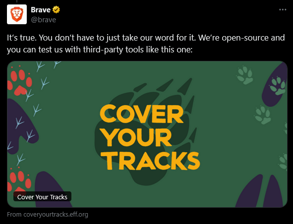 >>3650714 > таким образом ты наоборот себя делаешь более уникальным А кстати поэтому брейв и убрали агрессивную борьбу с фингерпринтингом. > И там у брейва нихуя не спуфинг, а рандомизация. Спуфинг это в лисе. У брейва и то, и то, зачем опять мне напиздел? > Покажи как Ебло, ну включаешь впн и смотришь. Я например пробовал еще через встроенный тор, так вот с допустим айпишником Германии время переводится на час назад. > На кой хуй Муллвад просит размер окна вернуть при его изменении и Letterbox включает? Угу угу угу, зощита, приватность, омномнимность, блокировка ануспринтинга. Думаешь нормальный человек, не пуганный красноглазиками, будет заниматься всей этой хуйней? Лол. > опять же засрешься как на выгрузке и заморозке вкладок. А разве я засирался там? Кажись тебе опять мерещится.