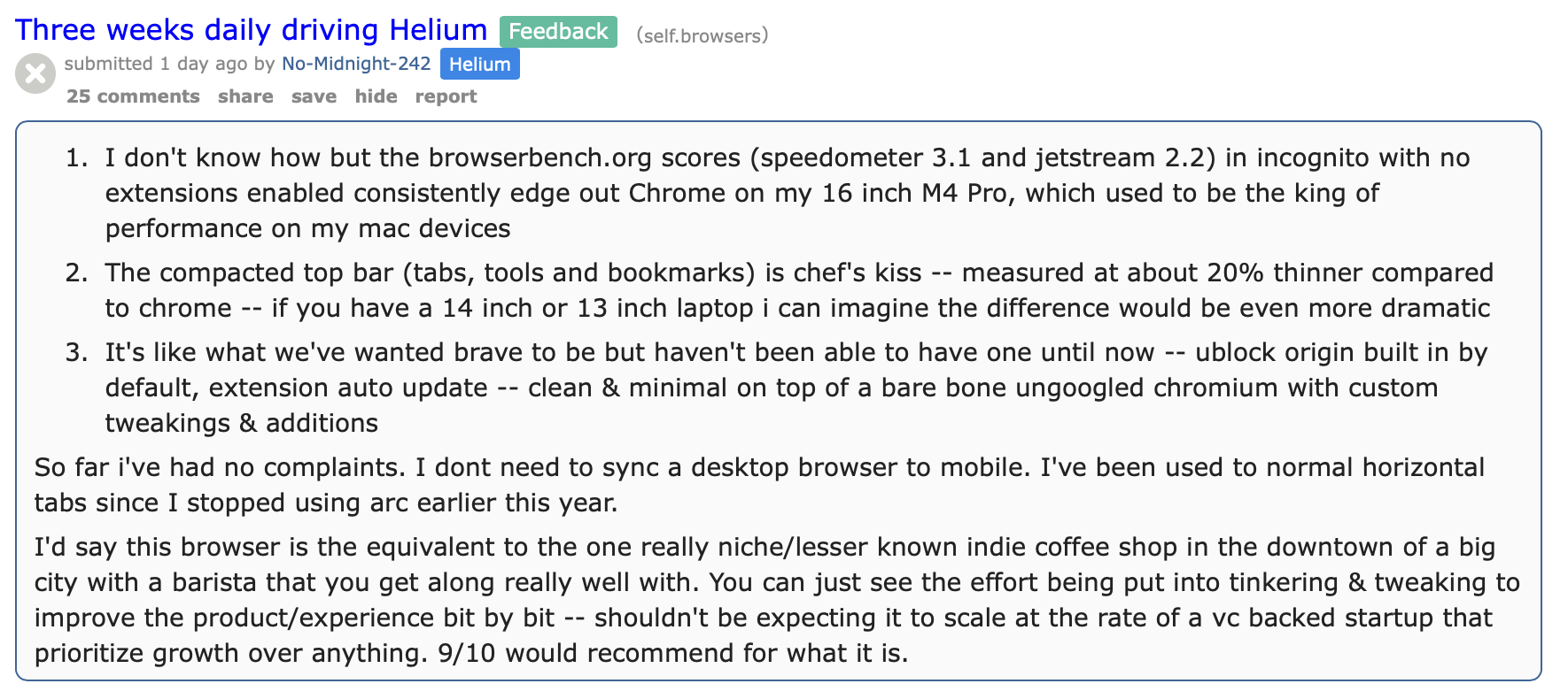 >>3643486 Да, у вивальди проблемы с анимациями (точнее их отключением: работает через раз), но всё ещё лучше, чем у васянки брейв, это на видриле видно. Только Firefox и Edge вменяемо подхватывают системную настройку выключения анимации, не открывая вкладки с эффектами смещения как в колхозных презентациях.