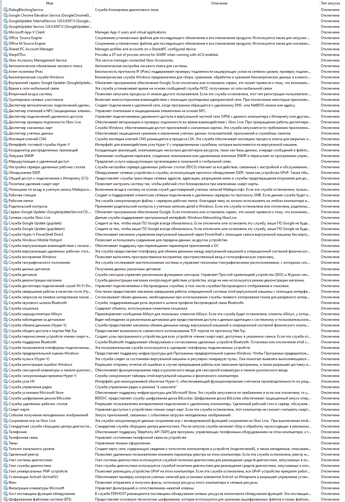Ты хуетой занимаешься. Единственное что можно выключить ради снижения ебки проца и диска жесткого это sysmain и антивирус + еще эдж удалить/вырубить из автозапуска который просто так в фоне всегда висит и оперативку жрет + ван драйв тоже самое в фоне висит его удалить нахуй + еще ради экономии места удалить стандартные приложения которые назуй не всрались + отключить зарезервированное место под под обновления + включить compact os. Всё остальное нахуй не нужно, то что ты выключишь в службах а заодно сломаешь на будущее тебе не добавит производительности ни ху я.
