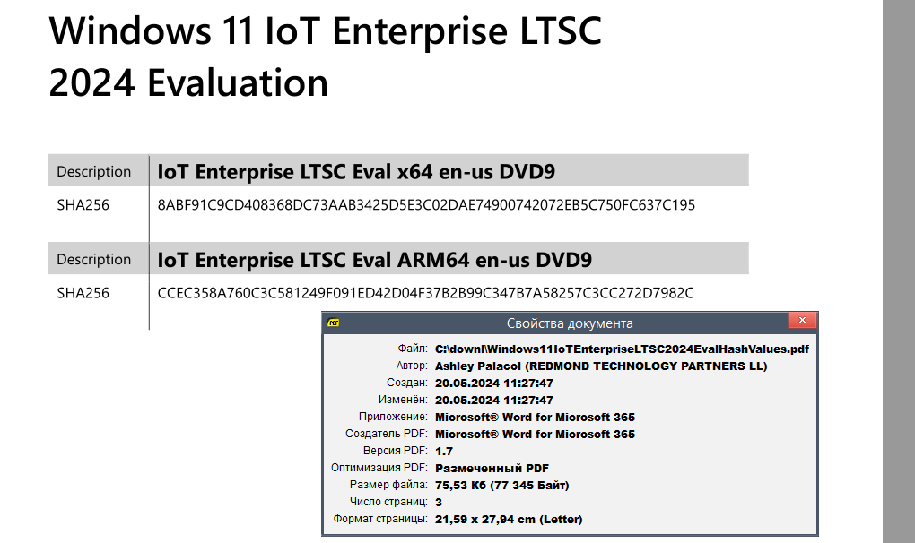 Хэши Windows 11 LTSC IoT ты без подписки в много тыщ долларов никак не увидишь. Только для демо-версии (которая называется Evaluation), которая работает 90 дней (у неё другие хеши, отличающиеся от нормально Windows 11 LTSC IoT).