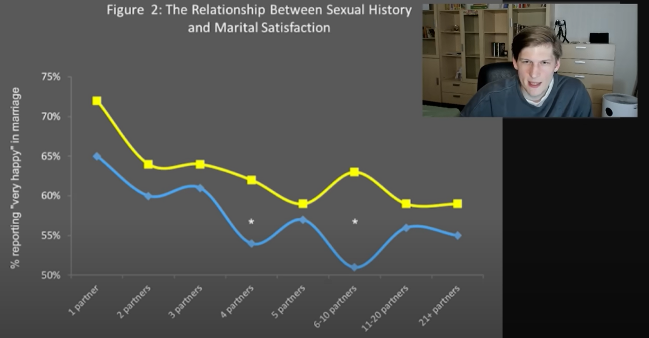 В части зависимости разводов и числа добрачных партнёров. Чот кажется мне что эта зависимость очень даже работает и в российских условиях. По-существу он прав, несмотря на кривоватую аргументацию.