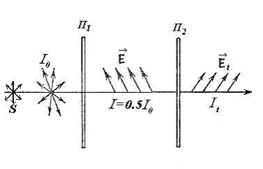 Поляризатор (анализатор) — это устройство, которое пропускает только ту составляющую вектора E, которая параллельна его оси пропускания. Остальная составляющая поглощается (превращается в тепло).