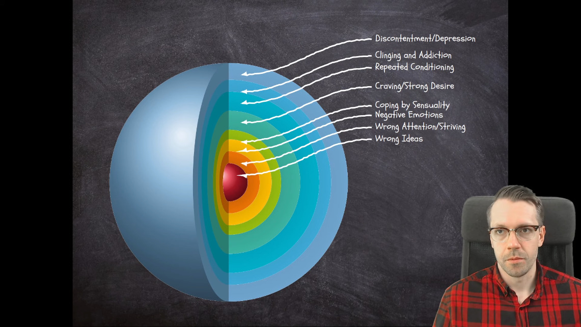 Мы не можем переживать любые чувства без нашего тела. И мы не можем испытывть вожделение (или любого чувства, вроде этого), без перспективы иметь хорошие чувства. Должен быть объект, что мы жаждем, что ощущается хорошо для нас, чтобы иметь вожделение или похоть. И затем на этом создается чувство себя (Я), которое пытается получить желанный объект, чтобы удовлетворить нашу жажду. И поэтому, чем дольше мы не удовлетворяем нашего желания, это приводит к страданиям.