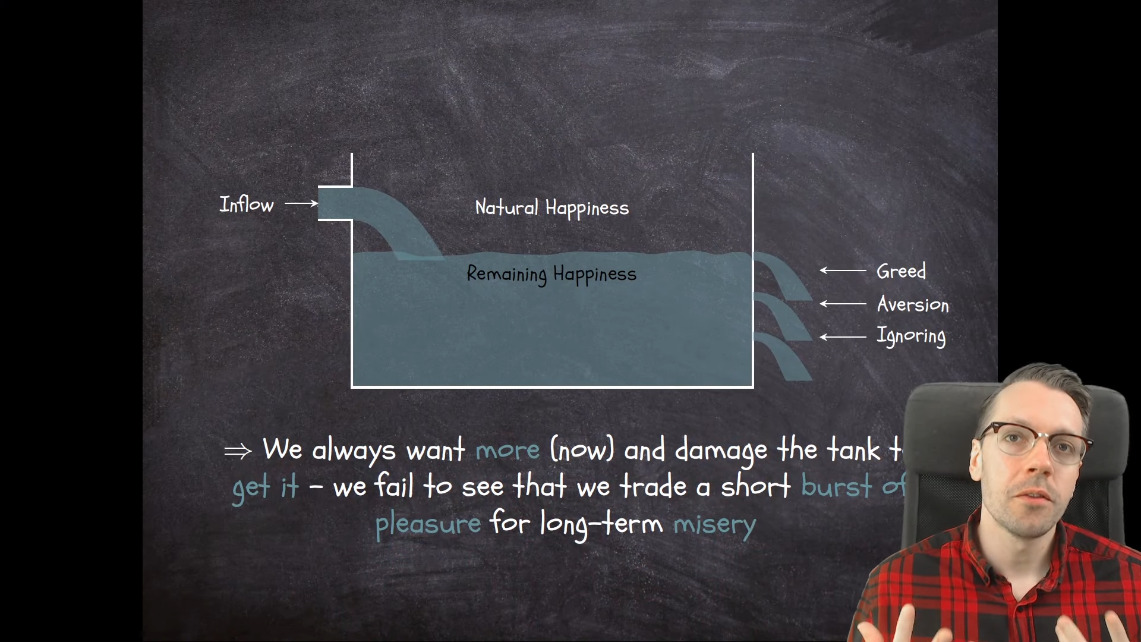 - Метафора с резервуаром хорошо показывает как счастье и удовольствие идут против друг-друга — они не могут сосуществовать, потому что следуя за импульсами удовольствий — всегда ослабляется счастье, даже если это чувствуется противоположным образом. Мы обычно ассоциируем счастье с удовольствием, т.к. мы немедленно действуем исходя из желаний (cravings) и таким образом боль уходит. Но удовольствие, импульсы и позитивные чувства не могут быть решением. Не бывает счастливых наркоманов — они могут выглядеть непринужденным какое-то время, но человек адаптируется к этому и спустя недели, месяцы - состояние достигает критического порога и ментальное состояние такого человека стремится вниз.