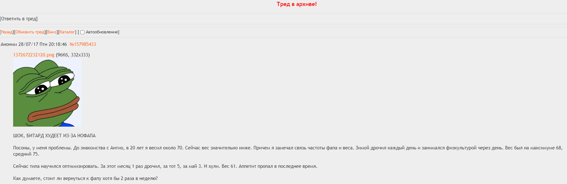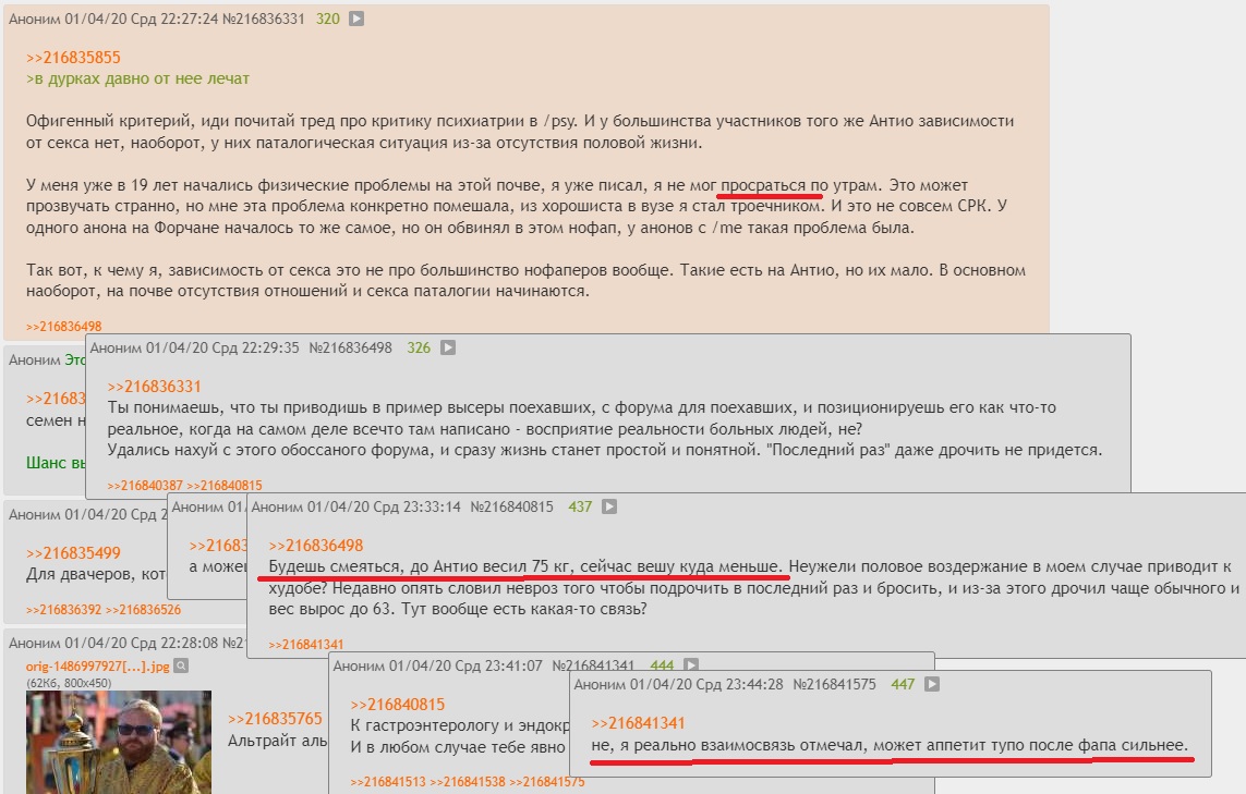 >>118869 Благодарю за ответ > Как можешь описать ощущения? Сколько держал? Да как и у всех. "Держал" максимум около 3-х месяцев, когда навалилось проблем и просто было не до просмотра картиночек, попутно не хавал сладкого и мучного, где-то раз в две недели были поллюции. Состояние в зависимости от внешних обстоятельств шаталось от ебейшего животного стресса до приятного умиротворения. Первое время сильно обострялись ощущения. Из-за окр на нофапе понял, НАСКОЛЬКО много раздражителей в виде реклам, баннеров, обложек видео и прочей дрисни, включая облегающую одежду тянок на улице. Кстати, много где уже сказано, что нельзя считать дни, потому что это включает ассоциативный ряд, связанный с фапом, а тот по привычным нейронным связям может привести к сливу. Это нужно в шапке прописать. >(6-15 раз за сутки) Ну, видимо, у тебя со здоровьем получше, чем у меня. А теперь представь, какое кол-во энергии ты бы мог сублимировать в созидание. > Чтобы толкового психиатра найти нужны деньги. Чтобы ПОДНЯТЬ БАБЛА (СТАЛИ ДРУГИМИ ДЕЛА) нужна воля + мотивация. Чтобы были воля + мотивация, нужно не разъёбывать их постоянным дрочевом. Всё так... Такая же ерунда и со здоровьем. Время и здоровье - самое ценное в жизни. Хотя, опять же, вышеперечисленное может быть и просто оправданиями. > Приведу пример - когда я давным-давно нашёл себе тянку Сейм. Я тогда чуть ли не на год забыл о проне и фапе, ещё и учебой был плотно занят, чисто в потоке был. Но спустя несколько лет, как только началась гойда полтора года назад, и уровень жизни просел, начал снова катиться в эскапизм и фап. Ну и можно сказать, что пронозависимость "помогла" в развале отношача. Тян спалила омеганство, охабалилась и начала ноги вытирать(возможно, вполне заслуженно). Исход очевиден. > ДЕЙДРИМИНГ (если кто-то тут тоже страдает такой хуетой) Навязчивые грёзы? Забыл про них сказать. У меня это чуть ли не с самого детсва. > найди нормального психиатра Да это понятно. Такое говно, походу, нужно лечить только фармой и терапией. Но я сча на нищем старте в пердях, ещё и очередная валютная гойда недавно была, так что пока возможности нет.