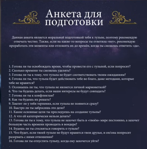 Краткое FAQ: 1.От этого можно поехать? Если имеются какие-то проблемы изначально, то можно нечаянно их активировать. С другой стороны, поехавшесть может помочь в форсе. Но лучше несколько раз подумать, прежде чем начинать, имея какие-то проблемы с психикой. Если всё-таки решитесь, главное — отбросить все предыдущие страхи. На заметку: тульпа — не шизофрения, а голоса при засыпании могут слышать все. 2.Зачем? Хочется идеального друга/идеальной любви, либо в целях самопознания и саморазвития. 3.Её можно, кхм, ну... того? Да, можно, если не веришь в суккубов и энергетический вампиризм. Однако подумайте: стали бы вы делать такое со своим творением, со своим дитём, которое по наивности примет такое как искреннее проявление любви? 4.Она прям как реальный человек? Разговаривает, общается, её видишь, чувствуешь? Почти. При долгом и упорном форсинге её голос будет вполне различим, а видимость тела может варьироваться от силуэтов на периферии зрения и просто очень качественного воображения до полупрозрачной и вполне себе детализированной модельки. 5.Сколько времени нужно, чтобы зафорсить тульпу? Если вы не готовы форсить больше шести месяцев, то начинать лучше не стоит, ведь вам придётся ежедневно посвящать время тульпе, да и само её создание для вас будет колоссальной работой над собой в плане воли и дисциплины. Сможете ли вы посвящать время не себе, а кому-то другому? Решайте сами. 6.У меня вопрос по вондеру... Тогда, для начала, прочитай это — http://pastebin.com/d7a69q7m 7.Нужна ли мне тульпа? Нет. 8.Почему тульпа носит бороду? Это на зиМУ-У-У.