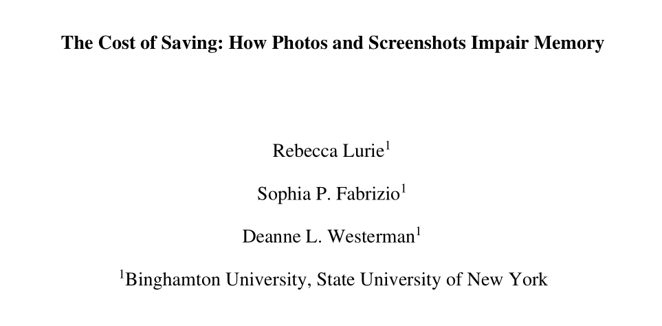 >>140551 The Cost of Saving: How Photos and Screenshots Impair Memory In sum, our results show that the photo-taking impairment effect is not diminished by reducing the difficulty or complexity of the saving task. Taking photos and screenshots leads to worse memory for the saved information, and this impairment occurs whether participants use their own device to save the information or use a device provided by the experimenters. Those taking screenshots or photos may want to be selective in what they choose to save to their devices, especially if they do not plan on reviewing these images. While some argue that the use of technology may change but does not necessarily harm cognition (Cecutti et al., 2021), we note the impairment in memory for screenshotted information is similar in magnitude to the deficit in recognition memory for amnesic patients compared to controls (Graf et al., 1984), suggesting that using the use of technology to store information does create a form of “digital amnesia.” Если коротко: фотография и скриншот - это право забыть. Наиболее чувствительные люди сами это ощущают, кто-то может почитать и задуматься. В ту же секунду, когда я достаю телефон или жму PrtSc - я получаю разрешение не помнить, работа памяти отключается. Ни о каком внешнем хранилище как о втором мозге нет и речи