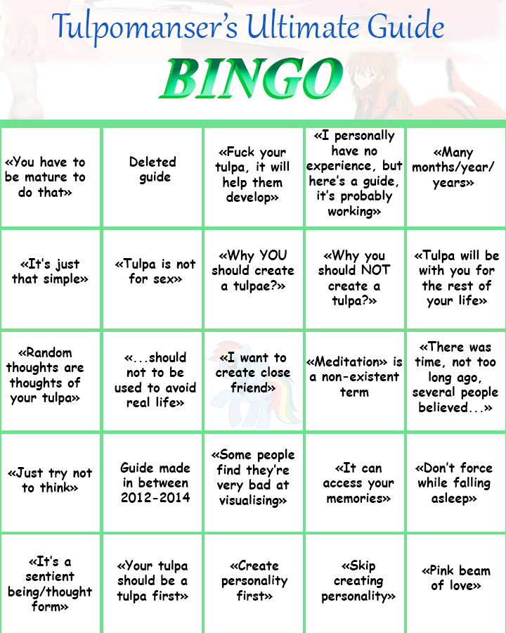 Краткое FAQ: 1.От этого можно поехать? Если имеются какие-то проблемы изначально, то можно нечаянно их активировать. С другой стороны, поехавшесть может помочь в форсе. Но лучше несколько раз подумать, прежде чем начинать, имея какие-то проблемы с психикой. Если всё-таки решитесь, главное — отбросить все предыдущие страхи. На заметку: тульпа — не шизофрения, а голоса при засыпании могут слышать все. 2.Зачем? Хочется идеального друга/идеальной любви, либо в целях самопознания и саморазвития. 3.Её можно, кхм, ну... того? Да, можно, если не веришь в суккубов и энергетический вампиризм. Однако подумайте: стали бы вы делать такое со своим творением, со своим дитём, которое по наивности примет такое как искреннее проявление любви? 4.Она прям как реальный человек? Разговаривает, общается, её видишь, чувствуешь? Почти. При долгом и упорном форсинге её голос будет вполне различим, а видимость тела может варьироваться от силуэтов на периферии зрения и просто очень качественного воображения до полупрозрачной и вполне себе детализированной модельки. 5.Сколько времени нужно, чтобы зафорсить тульпу? Если вы не готовы форсить больше шести месяцев, то начинать лучше не стоит, ведь вам придётся ежедневно посвящать время тульпе, да и само её создание для вас будет колоссальной работой над собой в плане воли и дисциплины. Сможете ли вы посвящать время не себе, а кому-то другому? Решайте сами. 6.У меня вопрос по вондеру... Тогда, для начала, прочитай это — http://pastebin.com/d7a69q7m 7.Нужна ли мне тульпа? Нет. 8.Почему тульпа носит бороду? Ой, не тот тег...