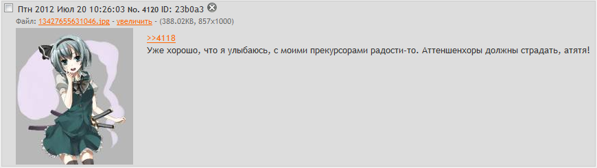 Здарова, молоденькие. Всё форсите. Можно вопрос не тралинга ради? Зачем все эти страдания многие из вас внатуре страдают, если можно то же количество сил влить в общение с реальными людьми и получить больше профита? Ведь всем нам нужно счастье, а счастье можно получить только тогда, когда на твои действия и слова есть обратный отклик. Не в виде туманных картинок в голове и мизерных эмоций где-то в глубине сознания (или чего там). Не бейте. ДЦ