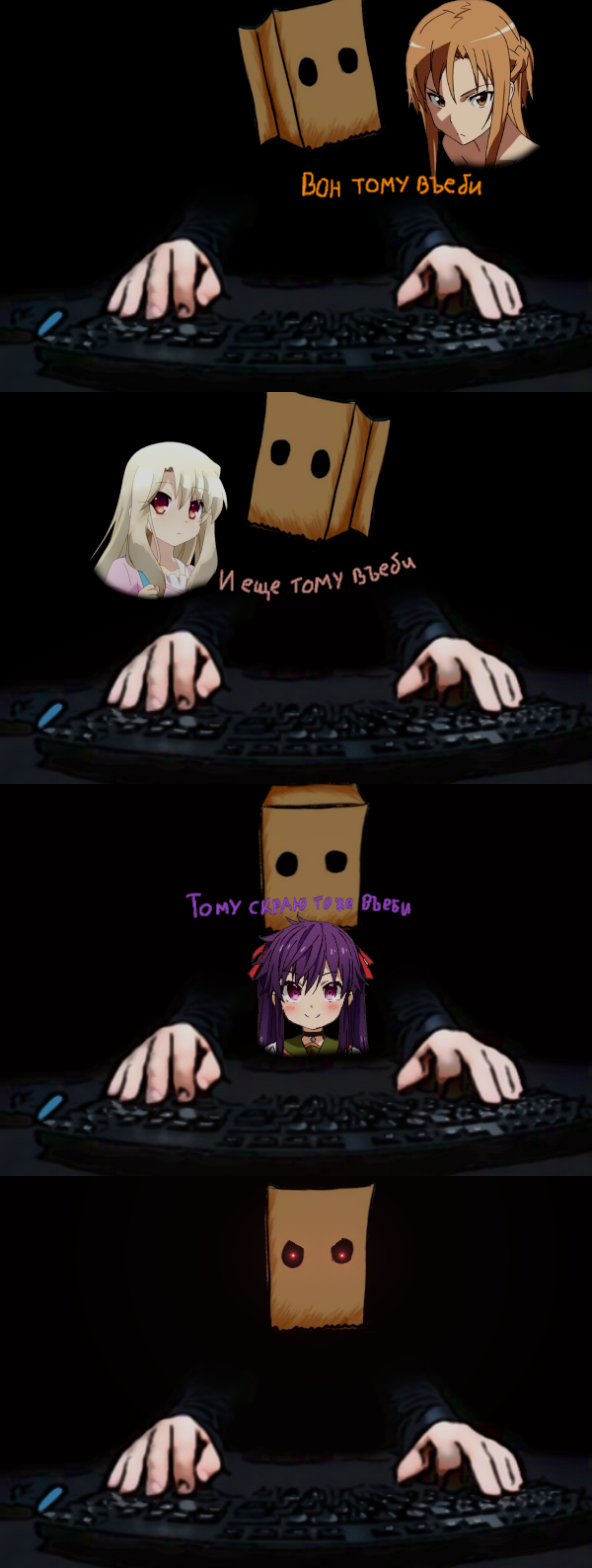 Послушав несколько эфиров пришло окончательное понимание того, насколько "таверна" бесполезное место. Как и причастность к комьюнити закоупивших фантазёров тульповодов со стажем или без него. Только соло, абсолютный запрет на мнение из вне, кто в том числе причастен к теме. Не подсчёт времени форса яд, не форсинг перед сном, не носочно-чулочные-попугайные паранойи, а комьюнити. Пидорашье. Мы дети пидорах, всё из детства. Моя тульпа не раз говорила, что во мне пидорашься сущность далеко скрыта, оно мешает и себе, и другим. Ничего кроме отвращения к бесполезно потраченному итт времени не имеется теперь.