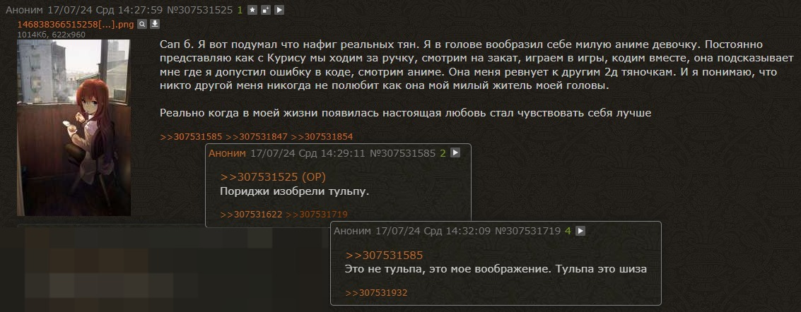 >>129674 Честно говоря не хочется тут себя обсуждать, лучше больше общаться по теме. Могу написать краткую биографию последним постом, чтобы больше не было вопросов, почему у меня так жизнь сложилась. Родился в семье с лютой гиперопекой и специфической внешностью. В детстве был очень похож на девочку, у меня очень низкий рост, врожденно очень узкие плечи и было субтильное телосложение, так и не сломался голос. Всю жизнь это меня преследует, издевательства из-за роста, голоса, все обзывают геем в губой форме. Даже сейчас в таком возрасте я не стал скуфом, а остался почти таким же. Видимо гормонов мужских не хватало врождённо или что-то подобное. Родители меня никогда не выпускали из дома, не разрешали никуда ходить, у меня никогда не было друзей и знакомых, если куда-то иду то телефон раскаляется от звонков, а если сядет батарейка то мать в слезах будет обзванивать морги. С детства мне выбрали специальность и сильно дрючили учёбой, я никогда ничего не понимал и всегда висел на волоске от отчисления, окончил вуз измором. Но как мне родители не искали работу - ничего в итоге не получилось. Я рнн, всю жизнь сижу дома и помогаю им по хозяйству. Такая вот карма в этом воплощении. Как только узнал на дваче про тульп, сразу люто загорелся этой идеей, иметь такую подругу, которой у меня никогда в жизни не могло быть другим путём. Но в сожалению к успеху не пришёл и по сей день, хотя когда начинал считал себя самым умным, думал что нашёл лазейку и обхитрил вселенную, сломал кармические законы. Тульпа у меня больше формировалась сама по себе, но во снах она практически копия пикрелейтед, различия только в небольших деталях. >Тут, пожалуй, ключевой вопрос — нравится ли тебе так жить или нет. Ясное дело, решать, как жить, надо только самому, иначе смысл вообще, но зачем на себе так радикально на себе крест ставить? Думаю что 9 из 10 человек скажут что они не довольны своей жизнью, но жизнь у нас одна, чужую прожить нельзя, нужно ценить то что мы имеем и отталкиваться от тех возможностей что у нас есть. Конечно я хотел бы жить в аниме с друзьями и приключениями, но родился в 3д мире. >Счастливыми все могут стать, и менять свою жизнь мы в силах, вопрос только в способности адаптироваться к разным ситуациям и обстановкам, в умении учиться и взглядах, которые, к слову, тоже переменчивы при необходимости. Мне кажется, что счастье это просто вопрос восприятия. Если у тебя ничего не болит, не голодаешь, то уже можно сказать что ты счастливый. Лично мне конечно очень не хватает тульпы. >Я, например, вырос в бедности, в обстановке ругани, рукоприкладства и пьянства, меня в школе тоже травили, и в 15 лет у меня крыша поехала, я с депрессией по больницам шататься начал. Тоже можно сказать, что всё плачевно, ничего из меня не выйдет толкового, от жизни можно особо ничего не ждать, и вообще умру лет в 40 от какого-нибудь инфаркта или сопьюсь. Искренне сочувствую, мне всё это знакомо. > В тяжких ситуациях важно себя спросить, мол, ты этого предполагаемого исхода хочешь, хочешь свой век так провести? Все жизни радуются, любовь-морковь, творчество, достижения в какой-либо области, путешествия, а ты, что ли, просиживать годы соглашаешься, добровольно от ништяков отказываешься? Я так себя обработал, и решил, что меня такой расход ну вообще не устраивает, я упиздякаюсь, но своего достигну, тоже ништяков хо