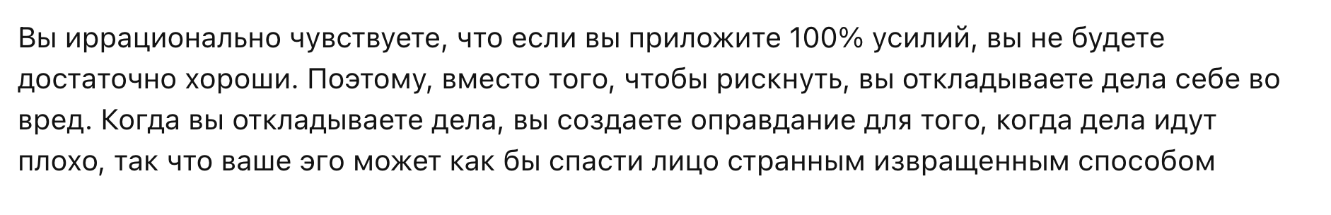 Работу я не ванговал. У тебя проблемы с самооценкой, раз ты принимаешь все на свой счет. Я имел ввиду абстрактную дно работу, на которую приходится идти юношам без образования, просто чтобы были деньги на элементарную жизнь. Я, благо, имею возможность не нуждаться в подобном, и тратить время на учебу. Кому-то повезло меньше, да но тред все же про прокрастинацию, поэтому оставим этот вопрос.