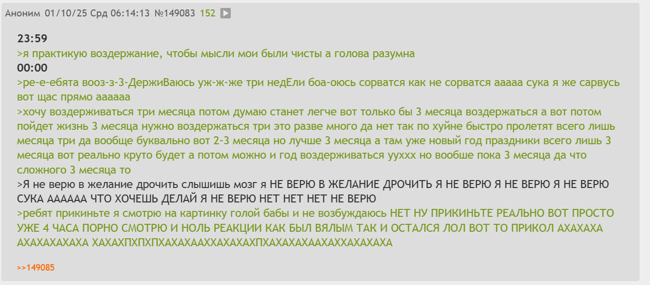 Бля, седьмой день, чуть не сорвался. Не удержался и пошёл читать публичный чат какого-то бота для фапа, ну как пример выкладывают. Был очень близок, чтобы решительно взять всё в свои руки, так скажем. Но очень не хотелось ломать цель на новый год и пересилил. Немного пощекотал дофаминчик фантазированием, пару-тройку минут и перестал. И быстро отпустило, прям полегчало щас, без остатка. Раньше в такие моменты я гарантировано обсирался, буду осторожнее.