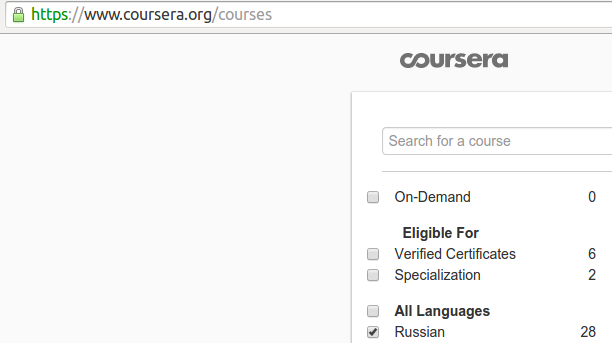 >>1524 >Скажите, как там фильтрануть новые курсы? Насколько мне известно, никак. Я тоже время от времени просматриваю курсы по интересующей тематике чтобы новые найти. Можешь на рассылку подписаться(или на рсс), они иногда анонсы новых курсов делают, но далеко не всех.