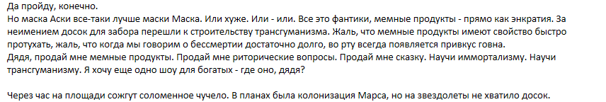 >>52059 Да пройду, конечно - духовному инвалиду это дело привычное. Только зачем звал тогда? Но маска Аски все-таки лучше маски Маска. Или хуже. Или - или. Все это фантики, мемные продукты - прямо как энкратия. За неимением досок для забора перешли к строительству трансгуманизма. Жаль, что мемные продукты имеют свойство быстро протухать, жаль, что когда мы говорим о бессмертии достаточно долго, во рту всегда появляется привкус говна.