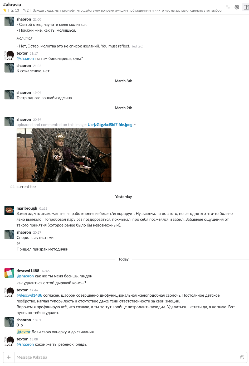 Проиграл с этого ЭРЗАЦ-ЛИДЕРА. Он реально удалился. Заархивировал тонну каналов, скопипастил 2.5 абзаца в un (https://2ch.hk/un/res/520551.html) и не выдержал моих насмешек. Уж на что у меня болезненное эго, но я никогда так сходу не рвался от оскорблений. В том числе его оскорблений. Хотя чести мне это, пожалуй, и не делает. И, справедливости ради, это был на удивление токсичный выпад, я сегодня в ударе.