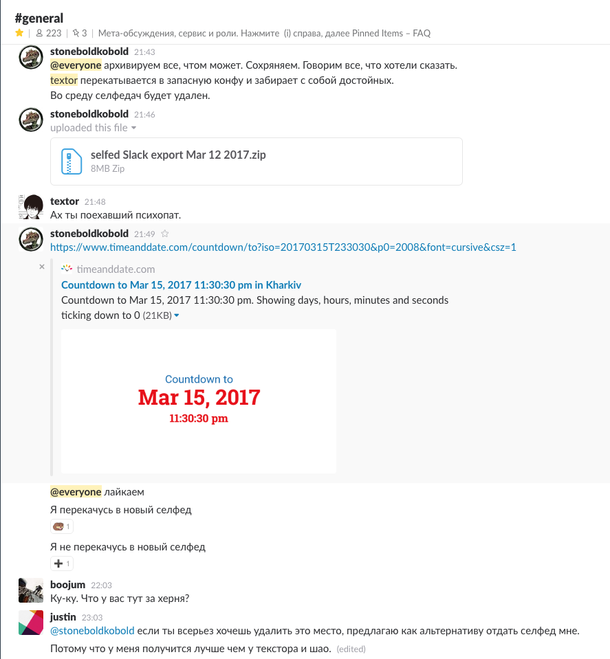 Selfed Могло ведь быть неплохим местом, если бы люди хотя бы манеру общения и уважение к другим участникам поддерживали. Но всё это скатилось в панибратство, а в следствии чего в токсичную среду. Я, конечно, не был участником этого сообщества, но судя по скринам и тому, как его участники в этом треде общались - моё утверждение выше - это правда.