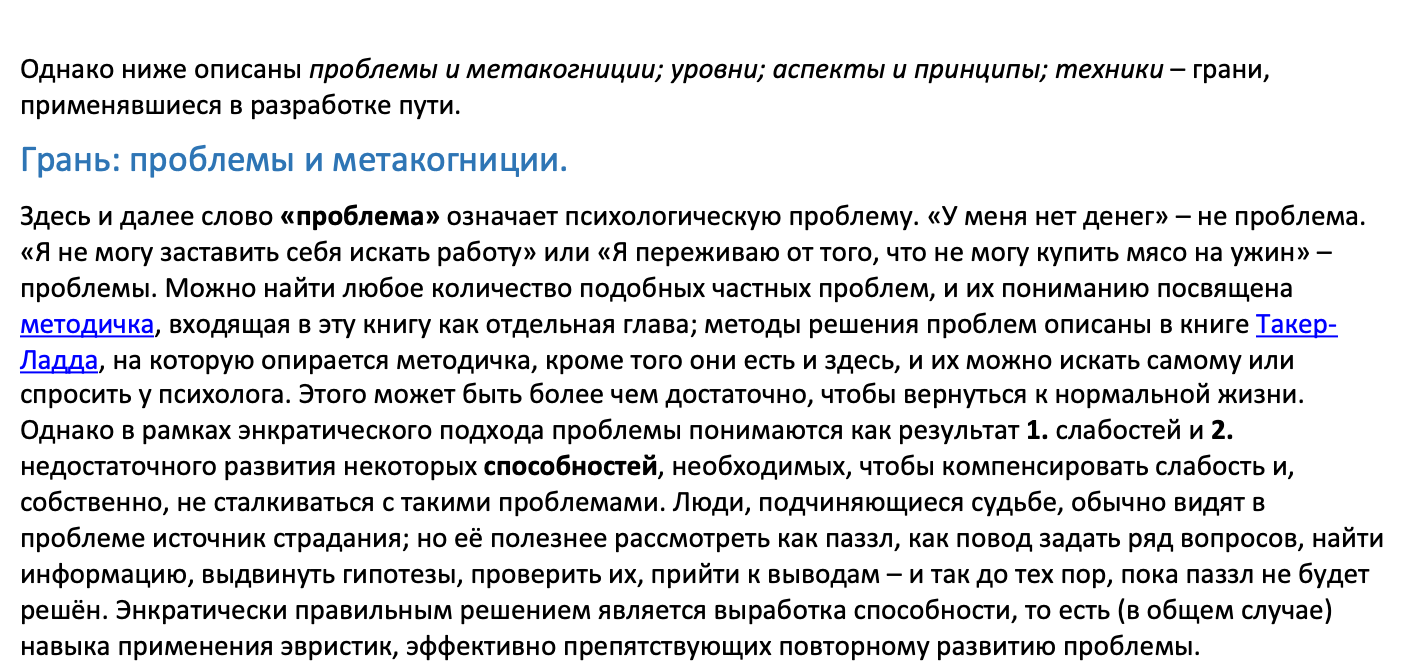 Вопрос, кто-то знает где найти методичку упоминаемую в следующем куске: >Однако ниже описаны проблемы и метакогниции; уровни; аспекты и принципы; техники – грани, применявшиеся в разработке пути. >Грань: проблемы и метакогниции. >Здесь и далее слово «проблема» означает психологическую проблему. «У меня нет денег» – не проблема. «Я не могу заставить себя искать работу» или «Я переживаю от того, что не могу купить мясо на ужин» – проблемы. Можно найти любое количество подобных частных проблем, и их пониманию посвящена методичка, входящая в эту книгу как отдельная глава; методы решения проблем описаны в книге Такер-Ладда, на которую опирается методичка, кроме того они есть и здесь, и их можно искать самому или спросить у психолога. Этого может быть более чем достаточно, чтобы вернуться к нормальной жизни. Однако в рамках энкратического подхода проблемы понимаются как результат 1. слабостей и 2. недостаточного развития некоторых способностей, необходимых, чтобы компенсировать слабость и, собственно, не сталкиваться с такими проблемами. Люди, подчиняющиеся судьбе, обычно видят в проблеме источник страдания; но её полезнее рассмотреть как паззл, как повод задать ряд вопросов, найти информацию, выдвинуть гипотезы, проверить их, прийти к выводам – и так до тех пор, пока паззл не будет решён. Энкратически правильным решением является выработка способности, то есть (в общем случае) навыка применения эвристик, эффективно препятствующих повторному развитию проблемы.