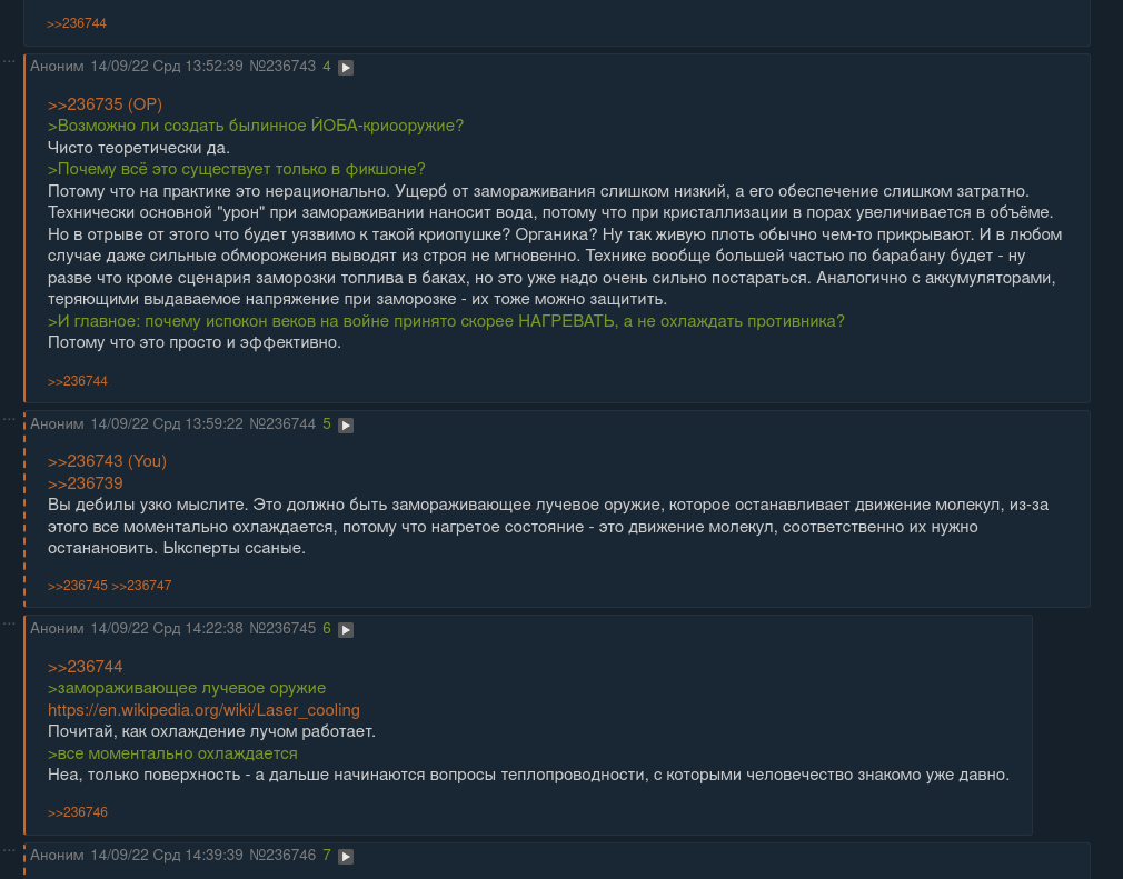 >>236735 (OP) >Возможно ли создать былинное ЙОБА-криооружие? Нет. Ёбы не будет. >Например, криогранаты Можно сляпать охлаждающие гранаты. Начинка - сжатое до большого давления высоколетучее вещество. При попадании в антмосферное давление будет быстро испоряться и уносить тепло, охлаждая поверхность, на которую попало. Но очень далеко не йоба >вроде бластера Мистера Фриза ХЗ что выше по требу насочиняли, но если будет такая технология, то можно придумать оружие и получше. Тупо сами лазеры охлаждать без радиаторов >сосулькомёта Мэй из Overwatch Можно, но нет смысла. Лед слишком хрупкий >почему испокон веков на войне принято скорее НАГРЕВАТЬ, а не охлаждать противника? Потому что термодинамика рекомендует жечь. Это дешево, а вот охлаждать - дорого
