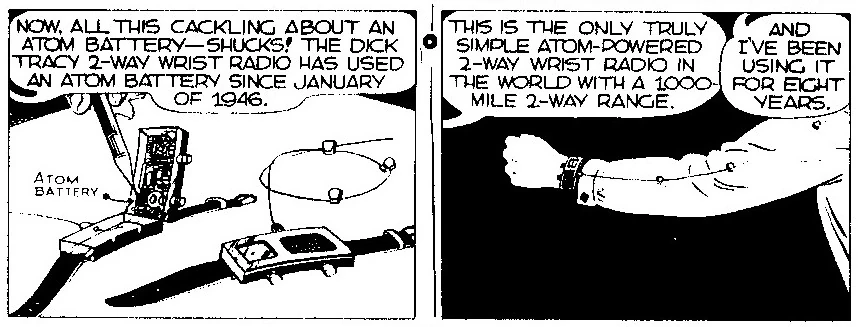 >>247503 (OP) Наручное радио Трейси впервые упоминается в выпусках с 13 января 1946 года а уже видео - с 1964 года, а транзистор появился только через год и то как лабораторный экспонат. Тут еще и атомные батареи подъехали. Но даже сейчас их мощность - микроватты.