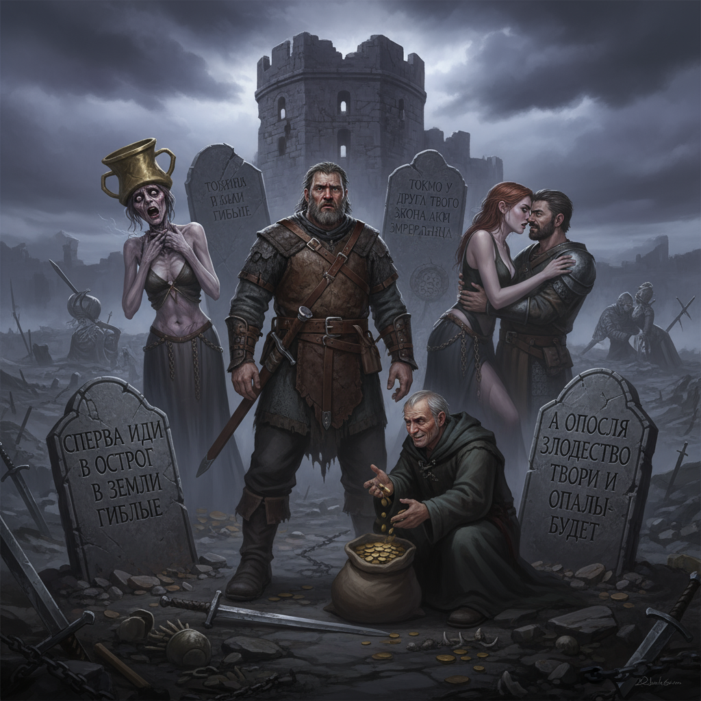 СПЕРВА ИДИ В ОСТРОГ В ЗЕМЛИ ГИБЛЫЕ @ А ОПОСЛЯ ЗЛОДЕЙСТВО ТВОРИ И ОПАЛЫ НЕ БУДЕТ @ ТОКМО У ДРУГА ТВОГО ЗЛАЯ ЖОНА АКИ ЭМБЕР-СРАЛЬНИЦА @ ЗА ГОДА В ОСТРОГЕ ПОДАВИЛАСЯ НАСМЕРТЬ @ А У ТЕБЯ И ЖОНА БЛУДНИЦА И БРАТ ТВОЙ ПЕРВЫЙ ВОЗЛЁГ С НЕЮ @ И ТОКМО ТОТ, КОГО ПОЛОЖИТЬ ХОТЕЛ ТЫ - ОТДАЛ ВСЁ ДО ГРОША